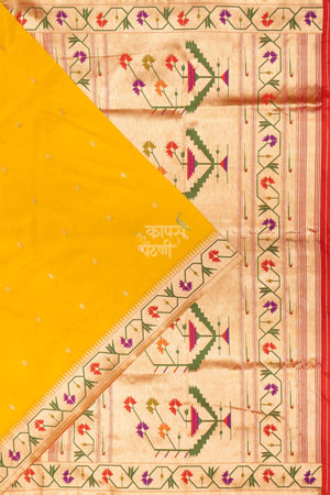 A vibrant Traditional Asavali Border Designer Saree in a rich yellow shade, crafted from semi silk for a graceful drape. Highlighted with elegant jari mango butti and a classic Asavali border, this saree brings together tradition and contemporary charm, perfect for festive and cultural occasions.