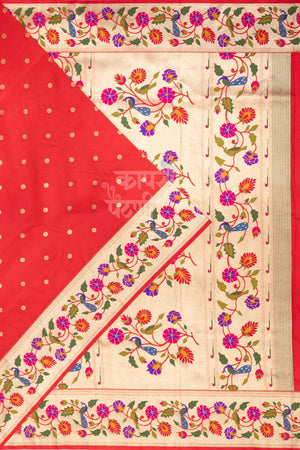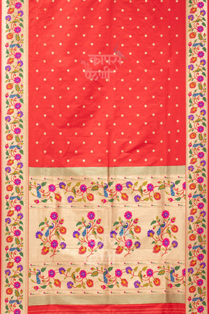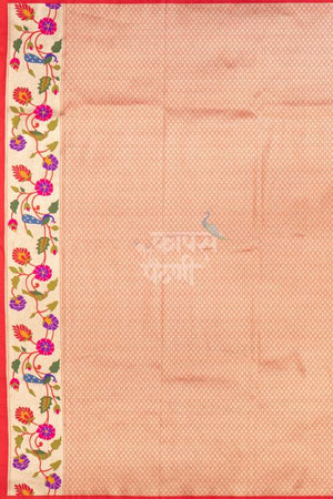 Make a bold traditional statement with this Designer Peacock Parrot Floral Border Saree in a striking red shade. Crafted from luxurious silk, it features a vibrant floral border adorned with elegant peacock and parrot motifs. The subtle jari butti across the body and the rich pallu enhance its festive charm, making it a perfect pick for grand occasions.