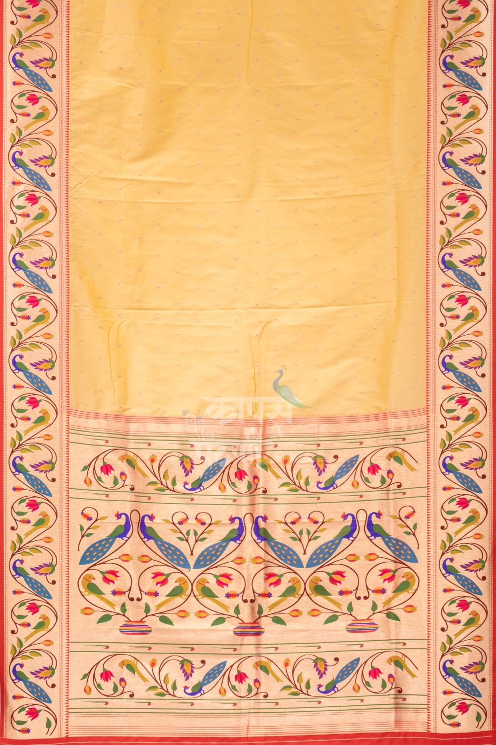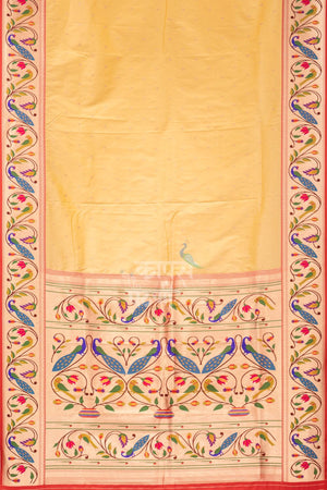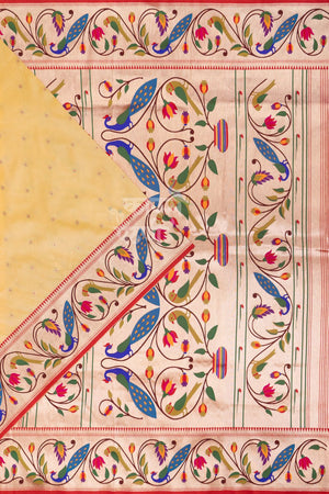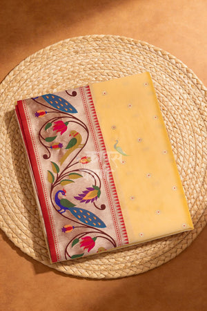 Brighten your ethnic collection with this Designer Peacock Parrot Floral Border Saree. Crafted from premium silk, it features a beautifully detailed border with elegant peacock and parrot motifs intertwined with floral patterns. The delicate jari meena butti on the body and rich pallu add a graceful and festive appeal, making it perfect for special occasions.