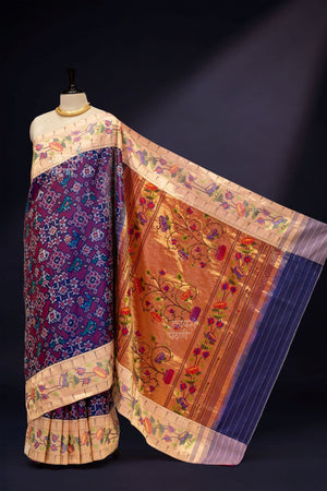 Make a striking statement with this elegant Hand woven Double Ikkat Lotus Paithani saree, crafted in rich silk with a fine machine weave. The saree features a stunning Patola-inspired body design in vibrant tones, beautifully complemented by a classic lotus Paithani border and traditional Muniya detailing on both sides. Paired with a luxurious rich pallu, this saree perfectly blends heritage artistry with contemporary elegance—ideal for grand celebrations.