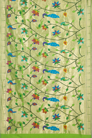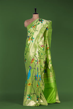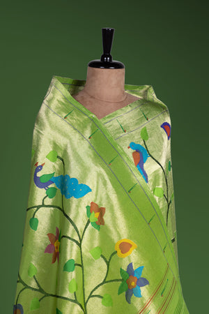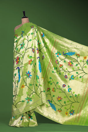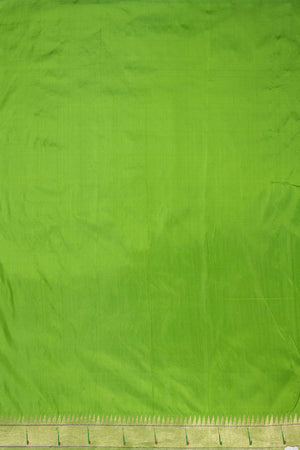 Radiating vibrant elegance, this Hand Woven Brocade Paithani in a stunning Parrot Green shade is a true celebration of traditional artistry. Crafted from 100% pure silk and meticulously hand woven, this saree features graceful floral motifs across the body that enhance its rich brocade texture. The classic Muniya border adds authentic Paithani charm, while the designer floral pallu creates a statement finish. Highlighted with metallic jari, this saree is an exquisite choice for weddings, festive occasions, and traditional ceremonies.