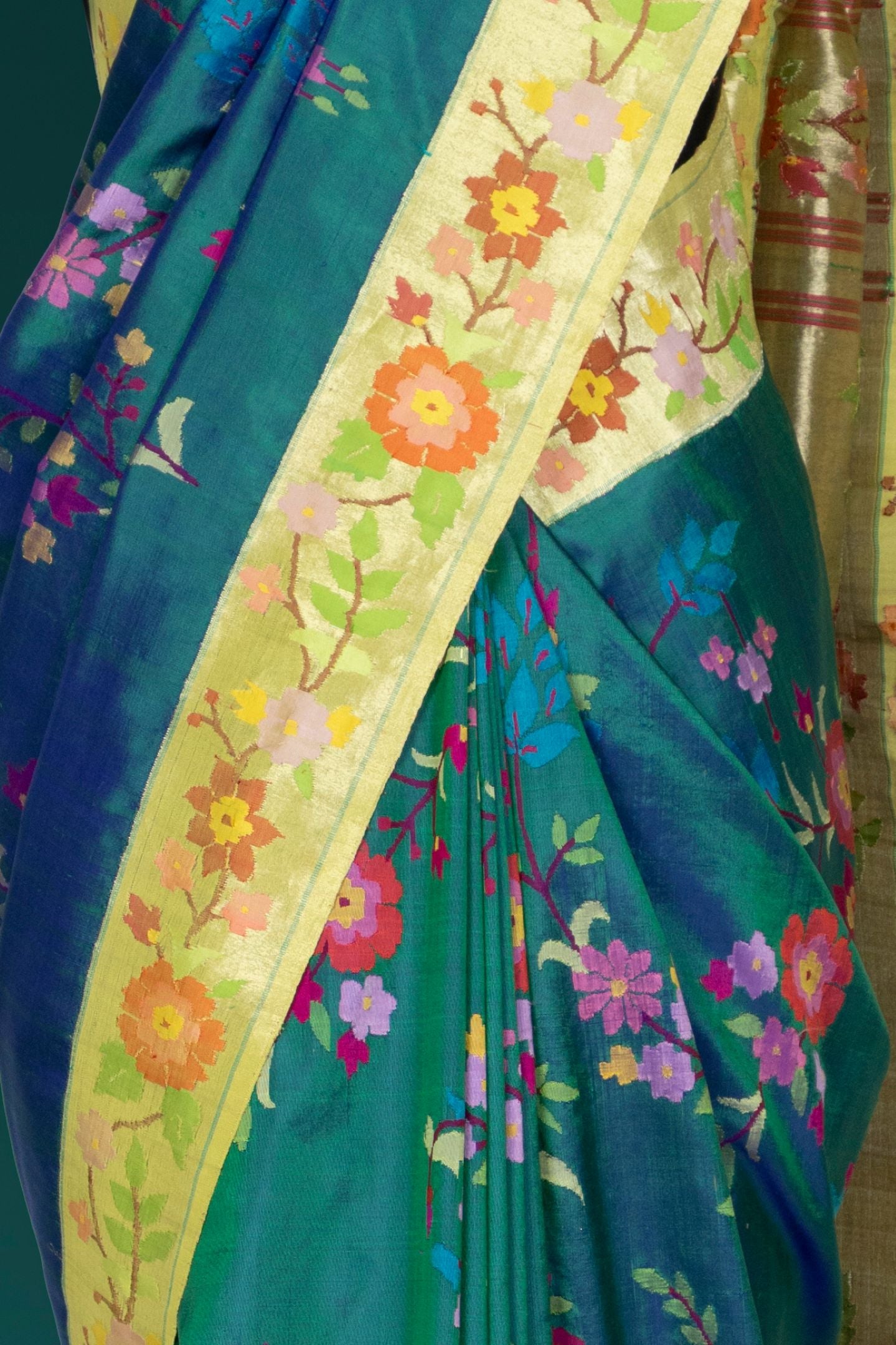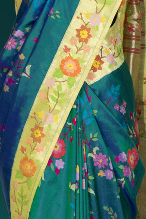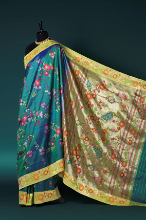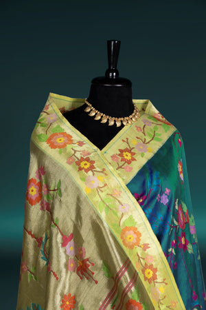 Elegant and distinctive, this Hand Woven Brocade Paithani in a graceful Greenish Blue shade reflects the beauty of traditional craftsmanship with a contemporary artistic touch. Crafted from 100% pure silk, the saree features intricate all-over floral leaf veil motifs woven across the body, creating a rich and detailed texture. The designer floral veil border enhances its uniqueness, while the luxurious floral leaf veil rich pallu adds a statement finish. Accented with metallic jari, this Paithani saree is perfect for weddings, festive occasions, and traditional ceremonies.