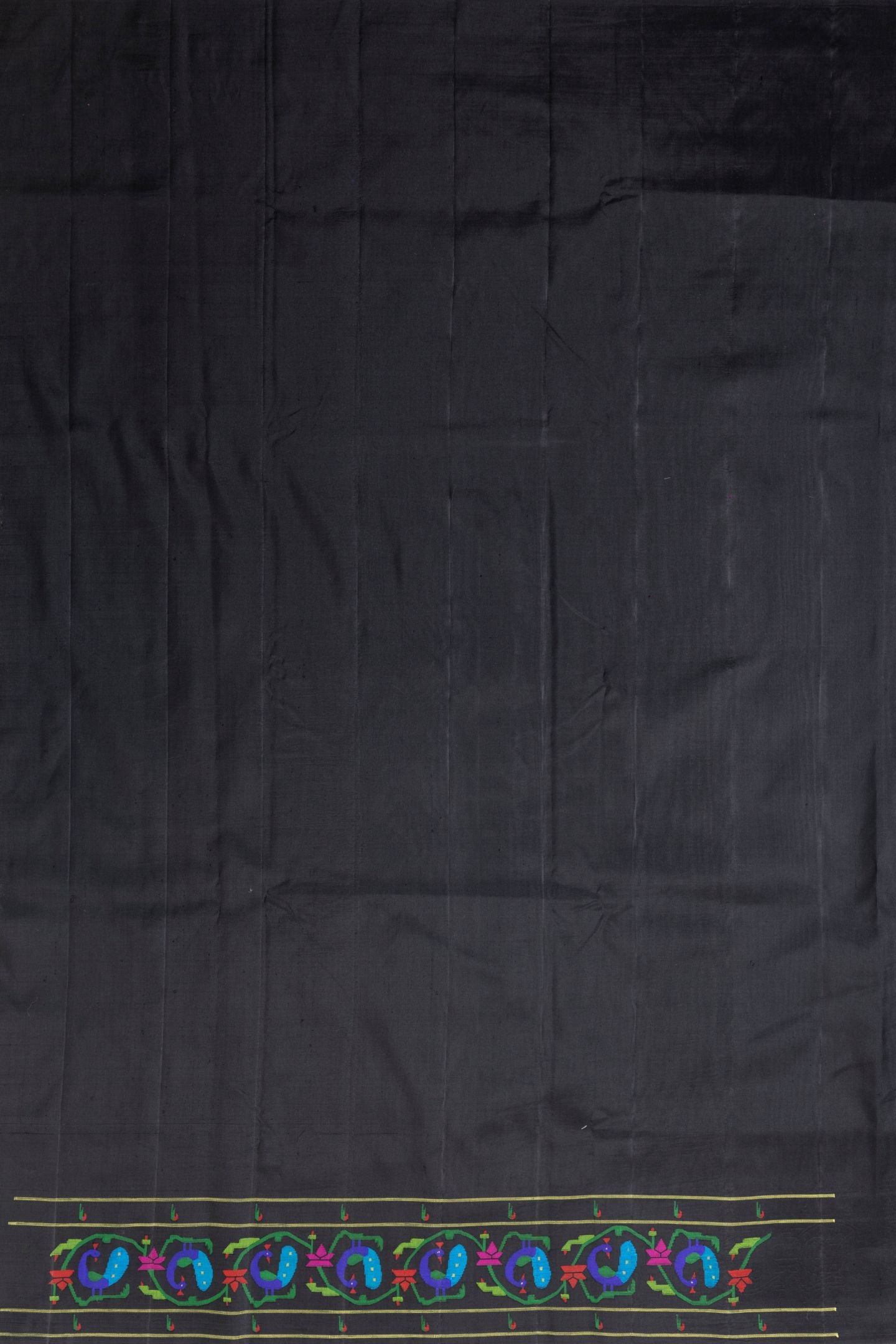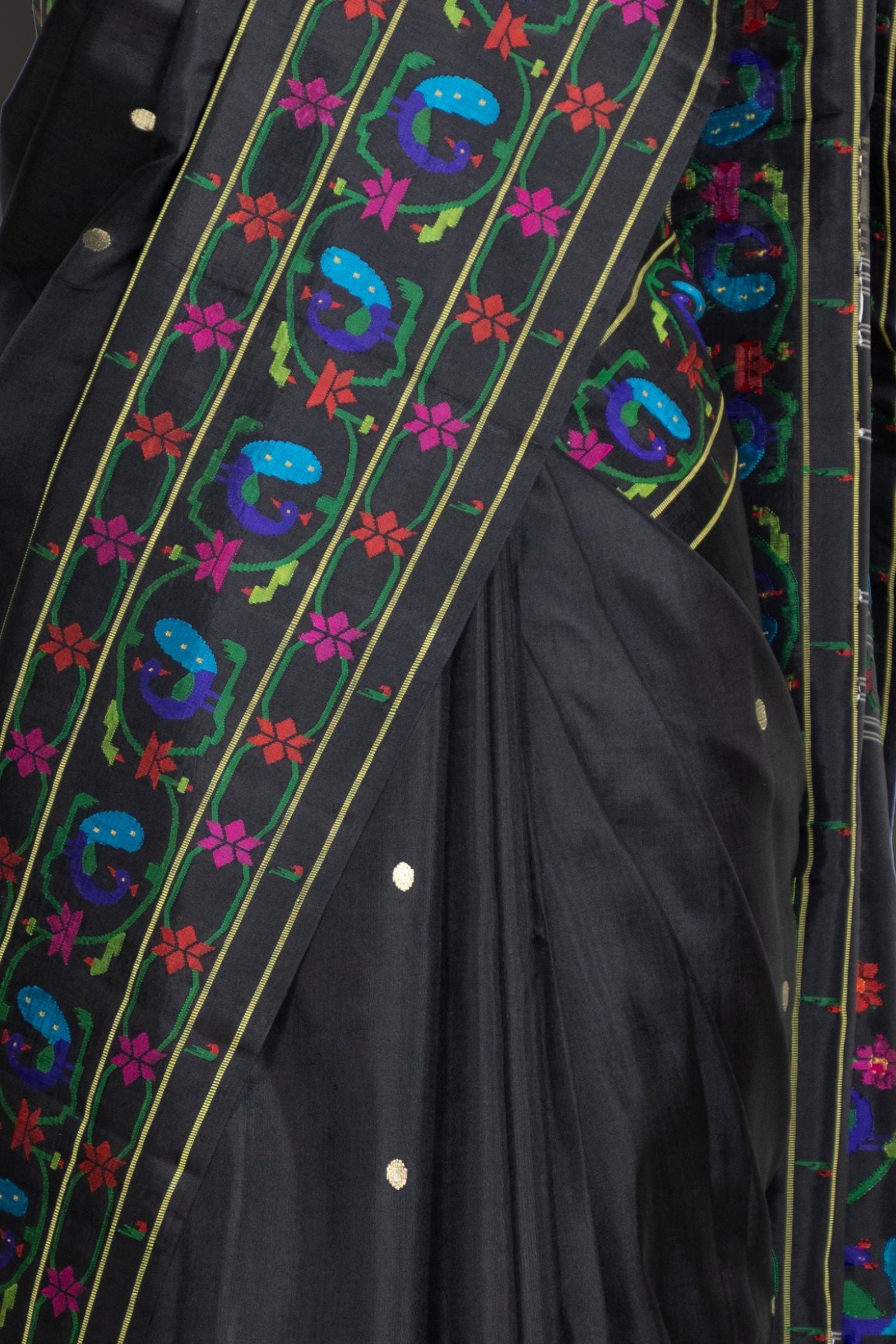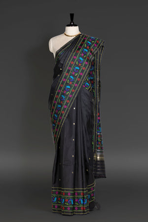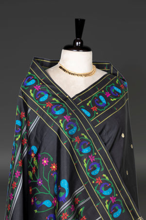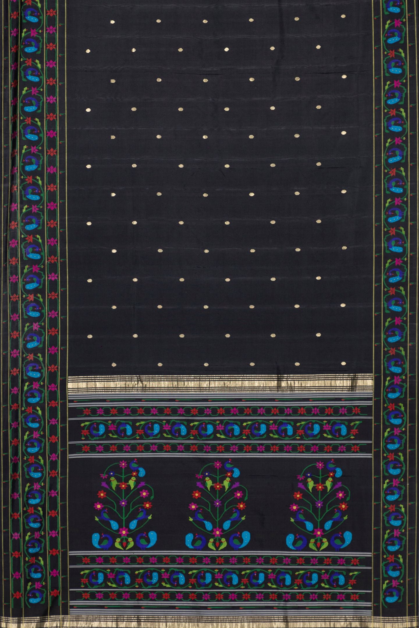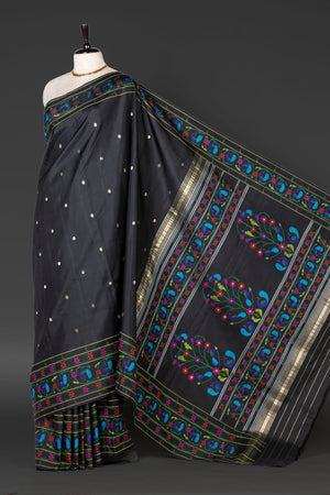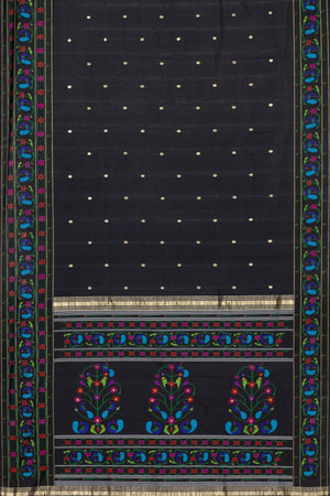 Timeless and regal, this Hand Woven Brocade Paithani in a classic Black shade beautifully reflects the grandeur of traditional craftsmanship. Crafted from 100% pure silk, the saree features elegant jari motifs across the body that add a subtle yet luxurious shimmer. The traditional peacock floral border with two-side Muniya detailing enhances its authentic Paithani identity, while the rich peacock, parrot, and floral pallu creates a magnificent statement. Accented with metallic jari, this saree is a perfect choice for weddings, festive celebrations, and traditional ceremonies.