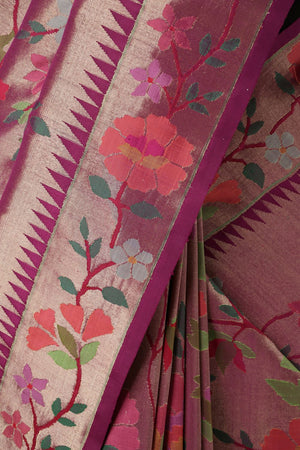 Crafted from Pure Tissue, the saree offers a naturally rich sheen, smooth texture, and graceful drape that enhances its regal presence. The hand weaving process — taking approximately 5 to 6 months to complete — speaks of the dedication, precision, and mastery involved in its creation, making it an heirloom-worthy textile.