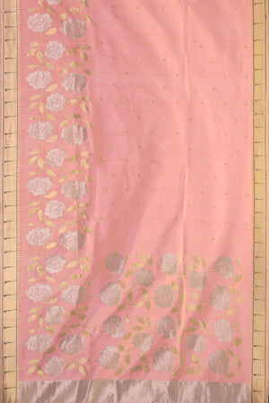 The highlight lies in its opulent Silver-Gold Jari Floral Design, intricately woven across the body and pallu. The harmonious blend of silver and gold zari creates a luminous effect, making it ideal for grand celebrations. The richly designed floral pallu enhances the regal appeal, ensuring a stunning look from every angle.