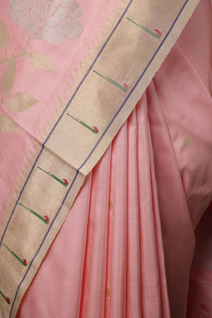 Elevate your ethnic wardrobe with this exquisite Hand Woven Brocade Paithani Saree in a graceful Light Gajri hue — a color that beautifully balances softness with festive richness. Crafted from pure silk, this masterpiece reflects the timeless heritage of traditional Paithani weaving, celebrated for its luxurious texture and intricate artistry.