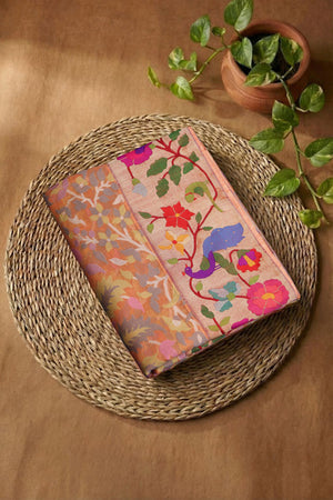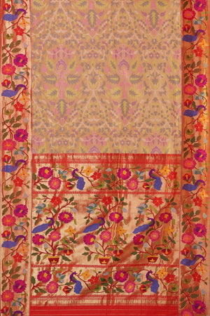Elegant and artistically crafted, the Hand Woven Brocade Pure Organza and Pure Tissue Paithani Fusion saree beautifully blends lightweight sophistication with traditional richness. Made from a luxurious combination of pure organza and pure tissue, this saree offers an airy drape with a soft shimmering finish. The brocade-style body is adorned with intricate leaf and floral designs that add depth and refined elegance. The designer peacock parrot floral border enhances the saree with detailed traditional motifs, while the richly woven pallu showcases vibrant peacock and parrot artistry. Presented in a graceful light brown shade and highlighted with metallic jari work, this saree is an ideal choice for weddings, festive celebrations, and special occasions.