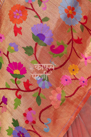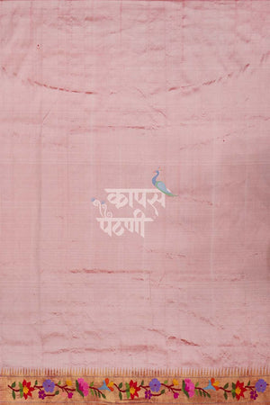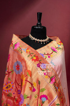 Indulge in regal elegance with this handwoven half all-over brocade Paithani saree in a soft blush pink tone. Crafted in pure silk, it features intricate zari motifs on the body, complemented by a stunning designer border adorned with peacock, parrot, and floral elements. The rich pallu showcases vibrant multicolor motifs with nature-inspired detailing, making it a true masterpiece for grand occasions.