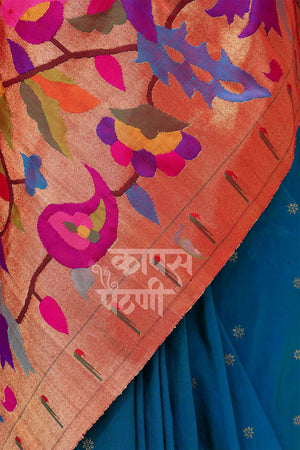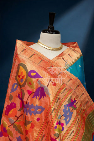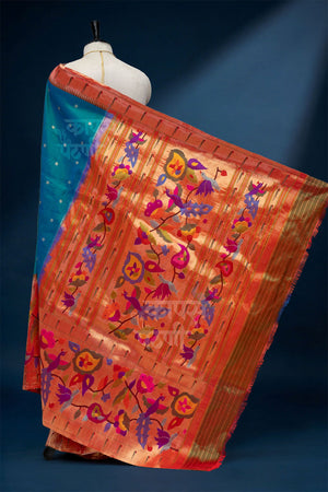 Celebrate vibrant heritage with this handwoven half all-over brocade Paithani saree, featuring a striking blend of deep blue and warm coral tones. Crafted in pure silk, it showcases intricate zari motifs on the body, paired with a beautifully detailed designer border adorned with floral, peacock, and muniya elements. The rich pallu, woven with colorful bird and floral patterns, adds a bold and artistic charm—perfect for grand festive occasions.