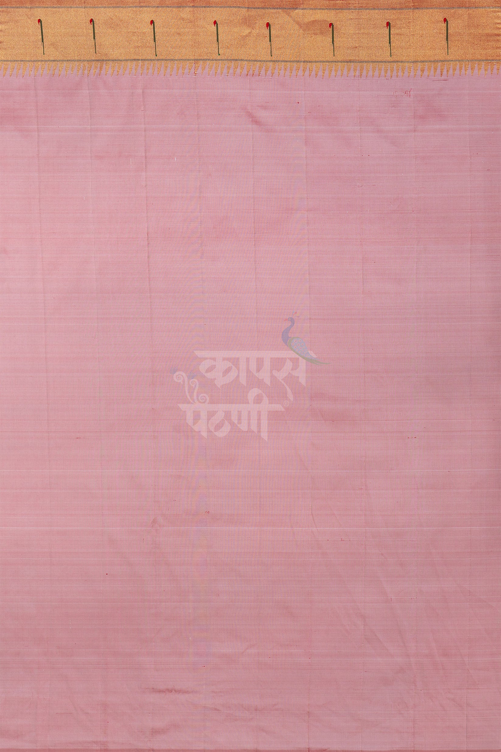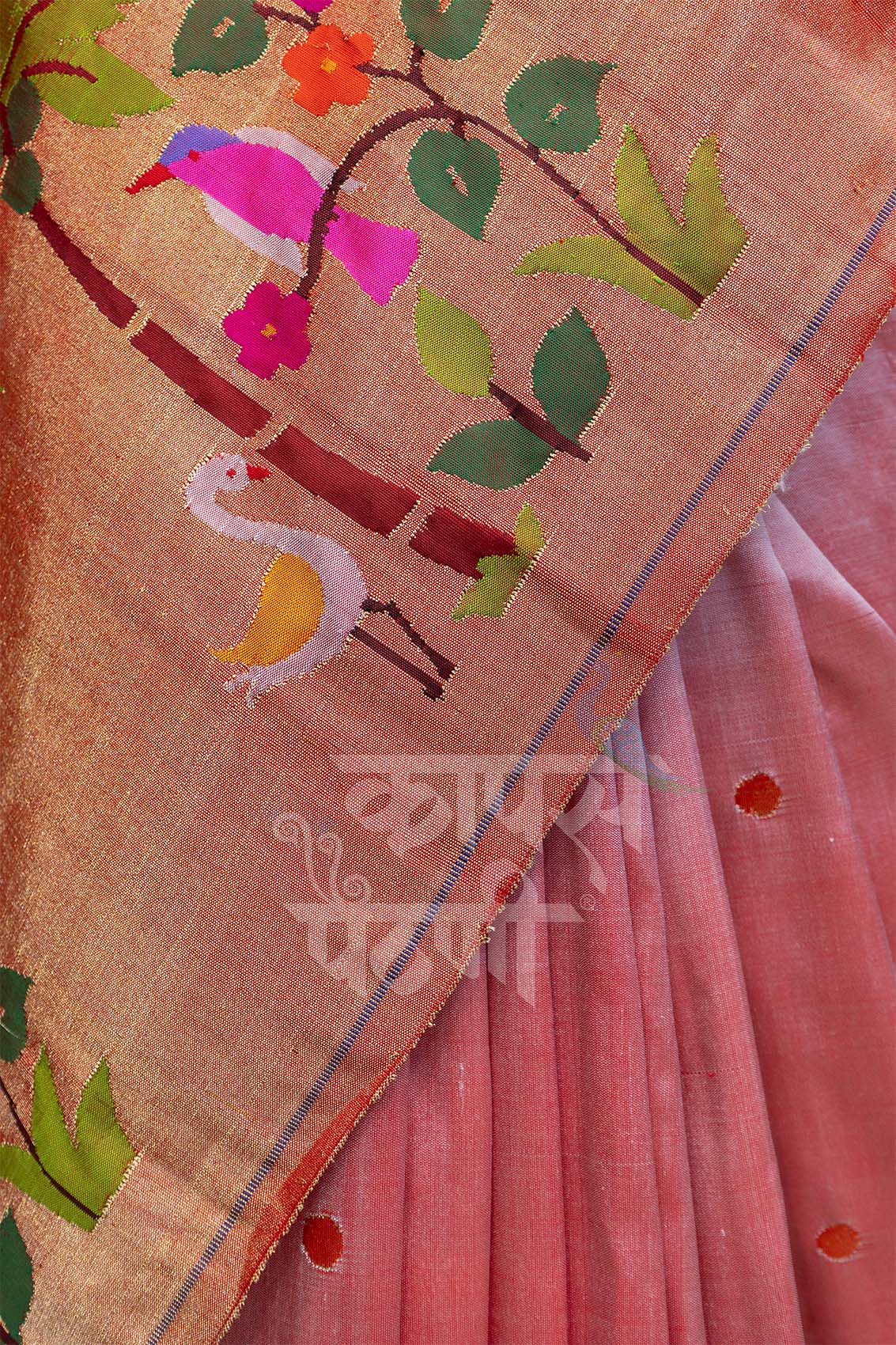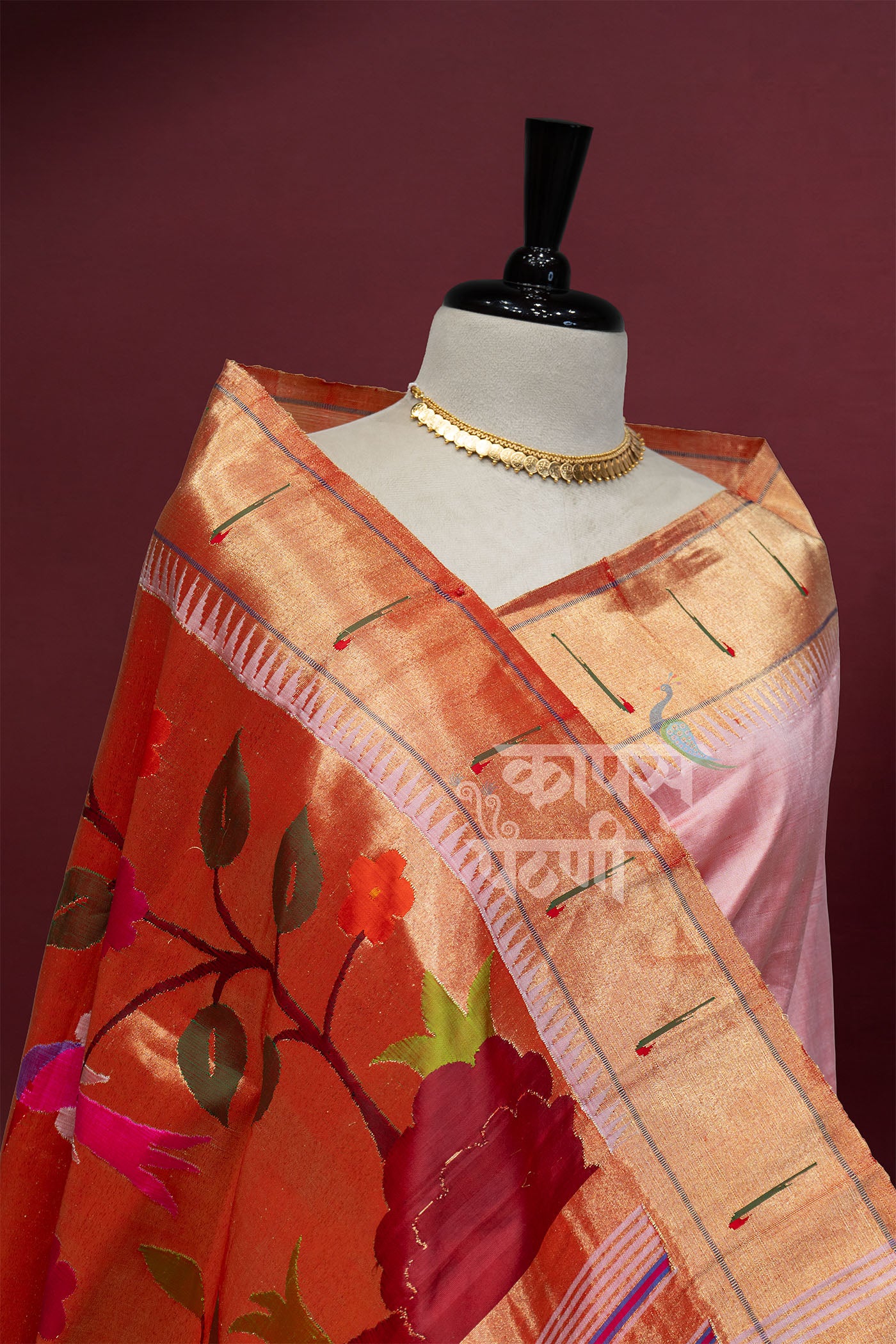 Soft, graceful, and beautifully detailed, this handwoven Paithani saree in a delicate blush pink shade is a perfect blend of tradition and charm. Adorned with intricate floral, coconut tree, flamingo, and bird motifs along with a classic Muniya border and rich pallu, this pure silk saree adds a subtle yet luxurious appeal to your festive wardrobe.