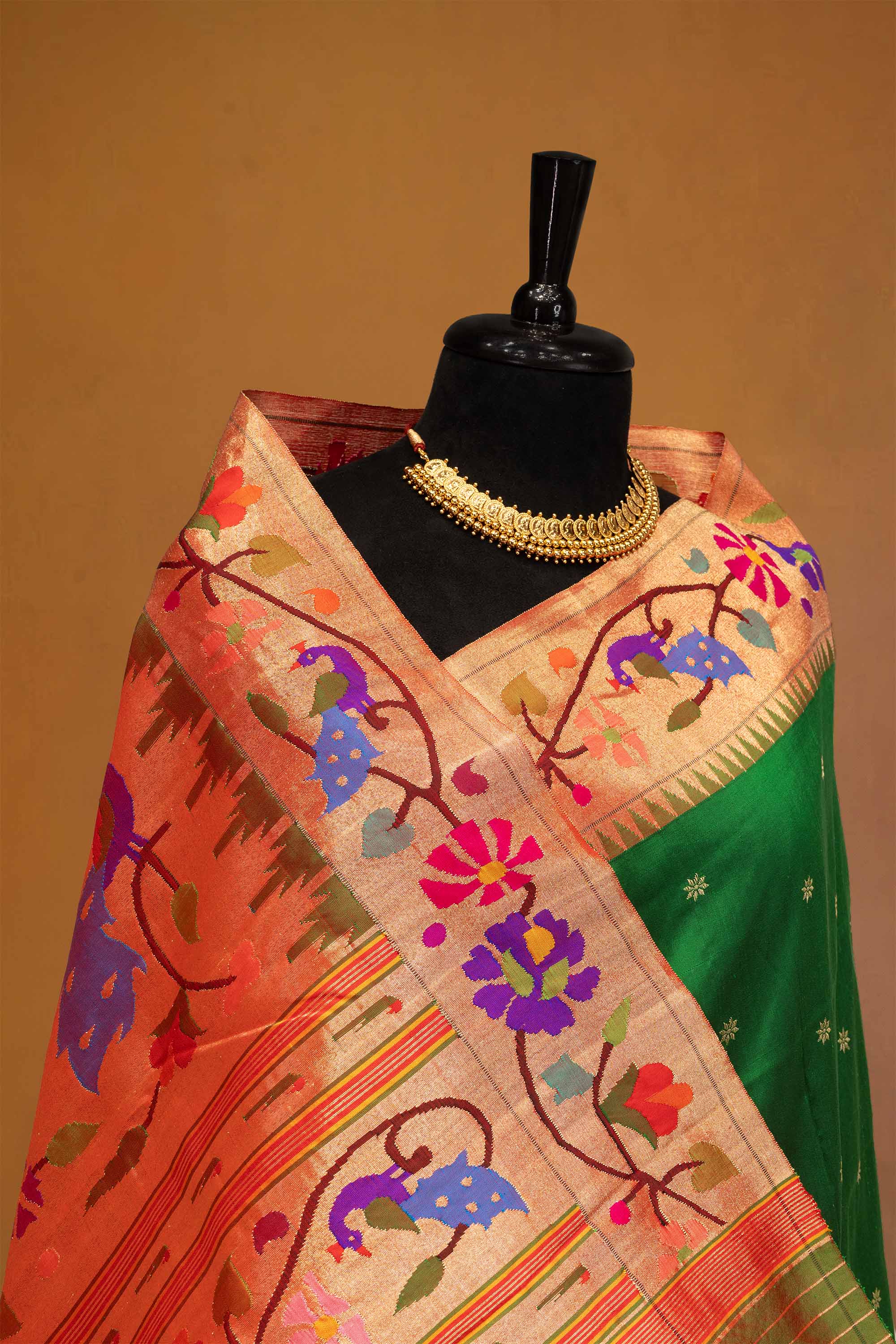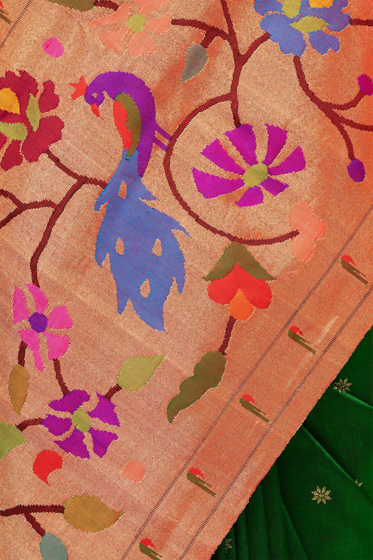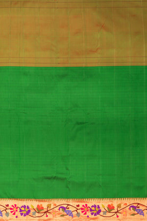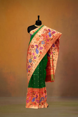 Elegant and rich in traditional artistry, the Hand Woven Half All Over Design Paithani is a beautiful reflection of classic Paithani craftsmanship. Made from 100% pure silk and carefully hand woven by skilled artisans, this saree offers a luxurious texture and graceful drape. The body features delicate jari butta motifs that add subtle richness and traditional charm. The striking peacock floral design border enhances the saree with intricate detailing inspired by nature and heritage Paithani motifs. Completing the look is a stunning designer peacock rich pallu that showcases the grandeur and beauty of traditional weaving. Highlighted with metallic jari work, this saree is an excellent choice for weddings, festive celebrations, and traditional ceremonies.
