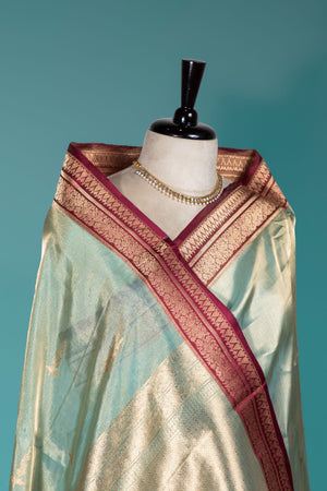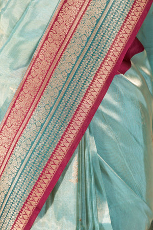 The Hand Woven Katan Tissue Butta Saree in soothing Pastel Sea Green is a perfect blend of elegance and understated luxury. Crafted from 100% Pure Katan Tissue Silk, this saree offers a luminous texture with a graceful drape. The body is adorned with delicate jari buttas that add a refined festive shimmer, while the Designer Border enhances its sophisticated appeal. Finished with a Plain Jari Pallu, this saree is ideal for weddings, festive occasions, and traditional ceremonies where subtle richness makes a lasting impression.