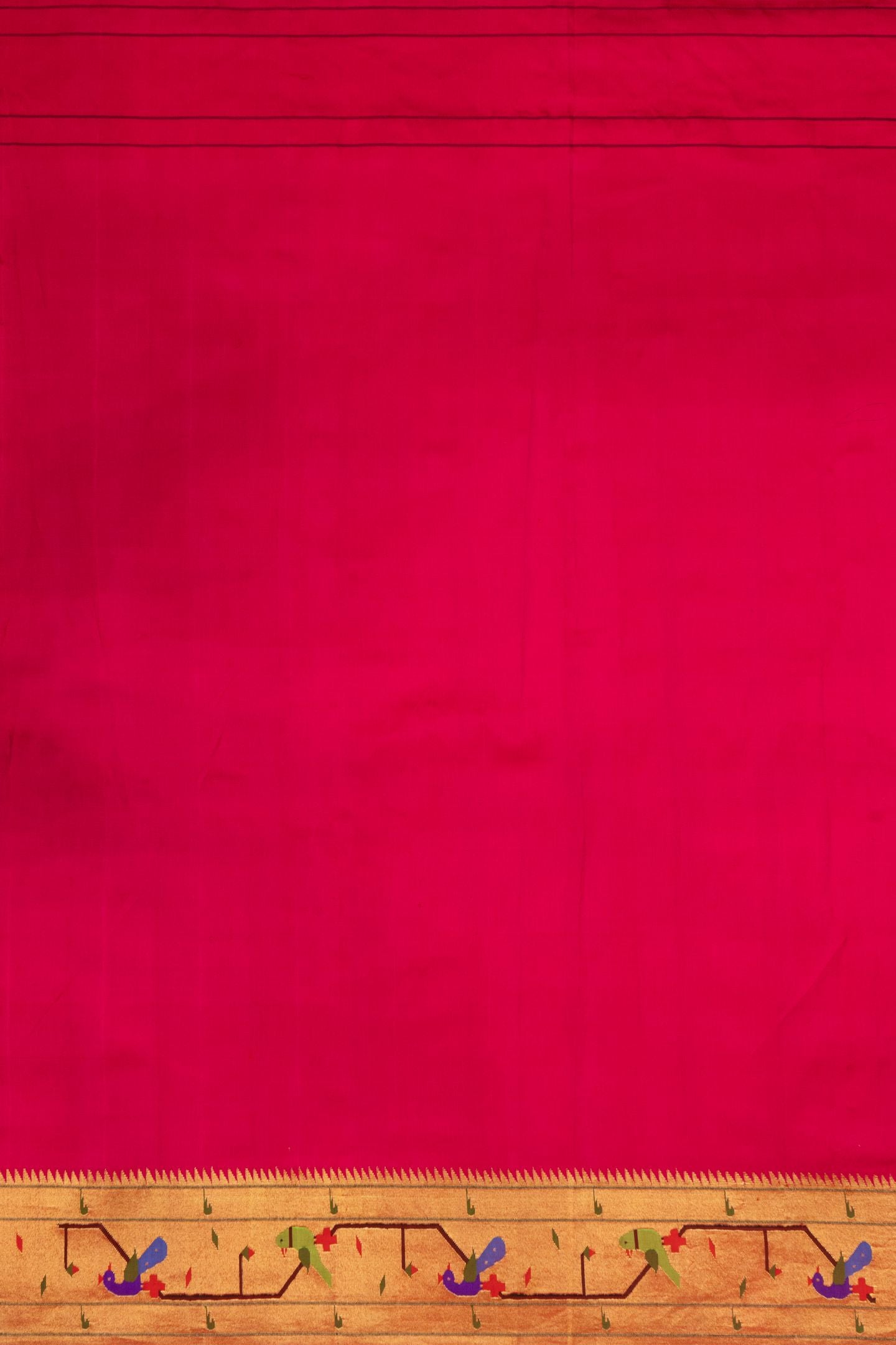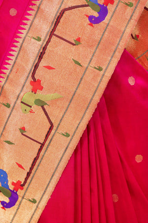 Graceful and rich in traditional elegance, the Hand Woven Peacock Parrot Pure Silk Paithani Saree in a vibrant Dark Pink shade beautifully reflects the heritage of classic Paithani weaving. Crafted from 100% pure silk and meticulously hand woven by skilled artisans, the saree features delicate jari butta motifs across the body that add subtle richness and refined texture. The traditional Peacock Parrot border highlights iconic Paithani artistry with intricate bird motifs, while the magnificent peacock rich pallu enhances the saree’s regal charm. Finished with metallic jari detailing, this saree embodies timeless craftsmanship and is an excellent choice for weddings, festive celebrations, and traditional ceremonies.