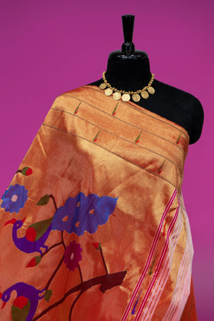 Soft, elegant, and timeless, the Hand Woven Pure Silk Triple Muniya Paithani Saree in a delicate Light Pink shade beautifully reflects the richness of traditional Paithani craftsmanship. Carefully hand woven from 100% pure silk, the saree features graceful jari butta motifs across the body that add subtle texture and refined elegance. The traditional Triple Muniya border, adorned with rows of classic parrot motifs, represents the signature heritage design of authentic Paithani sarees. Complemented by a magnificent peacock rich pallu and enhanced with metallic jari detailing, this saree radiates cultural charm and sophistication, making it a perfect choice for weddings, festive celebrations, and traditional ceremonies. craftsmanship.