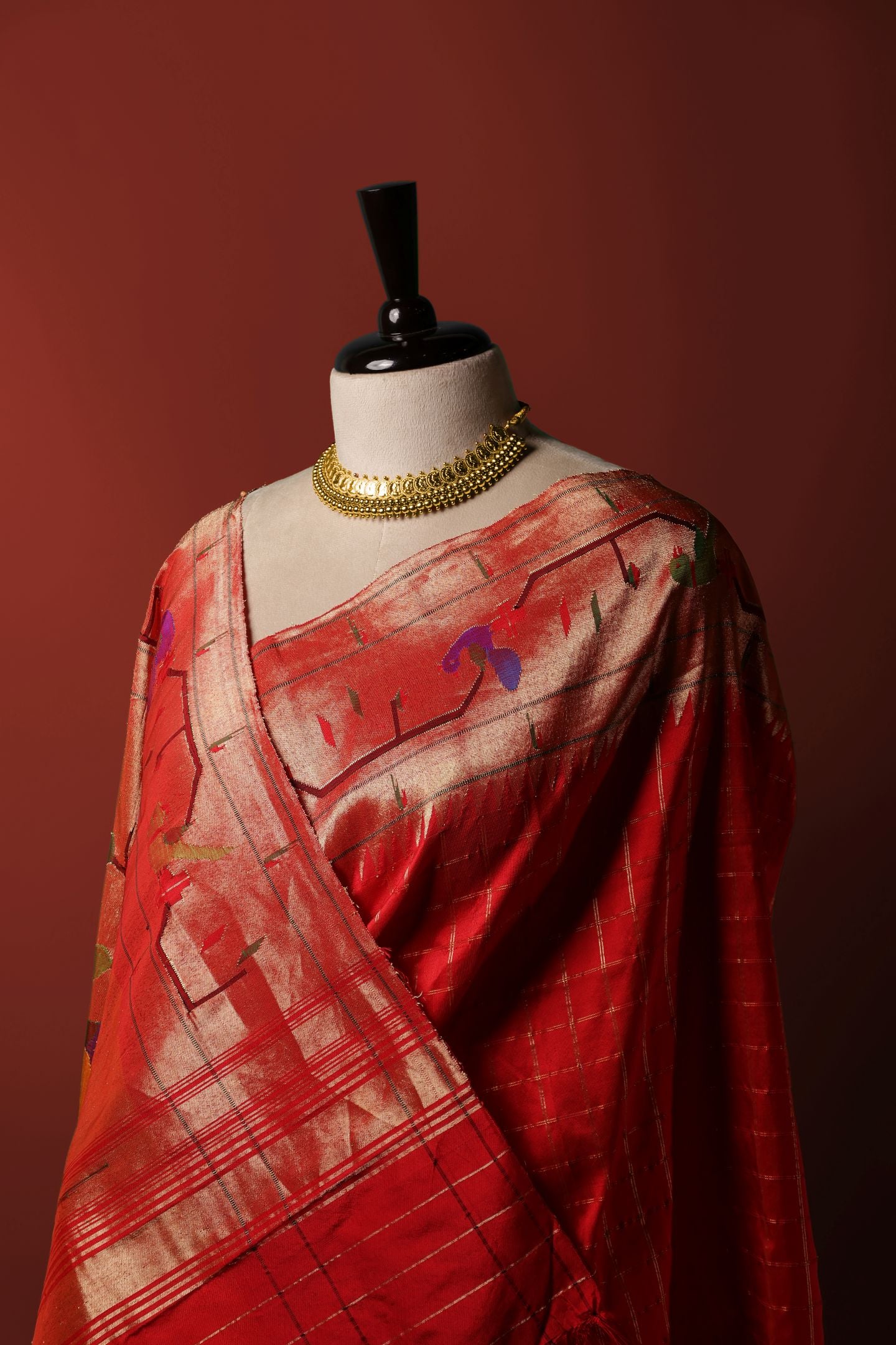 Celebrate timeless Maharashtrian heritage with this Handloom Checks Peacock Parrot Border Paithani Saree, a graceful blend of classic geometry and rich traditional artistry. Woven entirely by hand using age-old Paithani techniques, this saree reflects unmatched craftsmanship, cultural depth, and ceremonial grandeur.