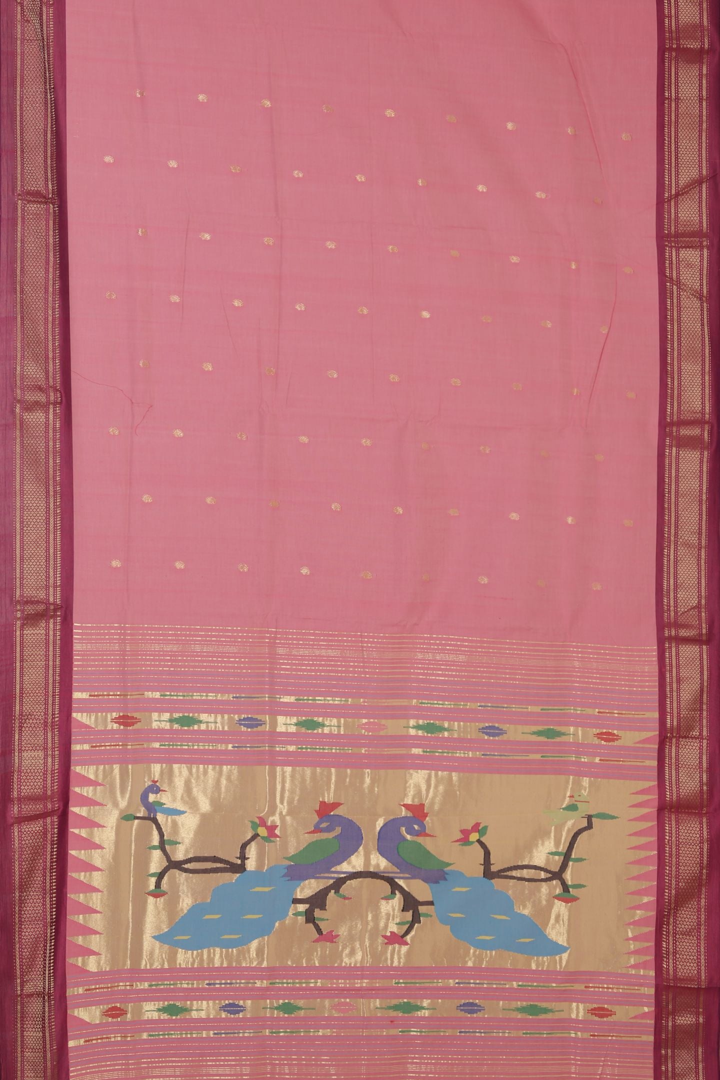 The body is adorned with classic Golden Mango Butta (Kairi motifs), woven all over using bright Metallic Gold Jari. These auspicious motifs enhance the traditional Paithani appeal.