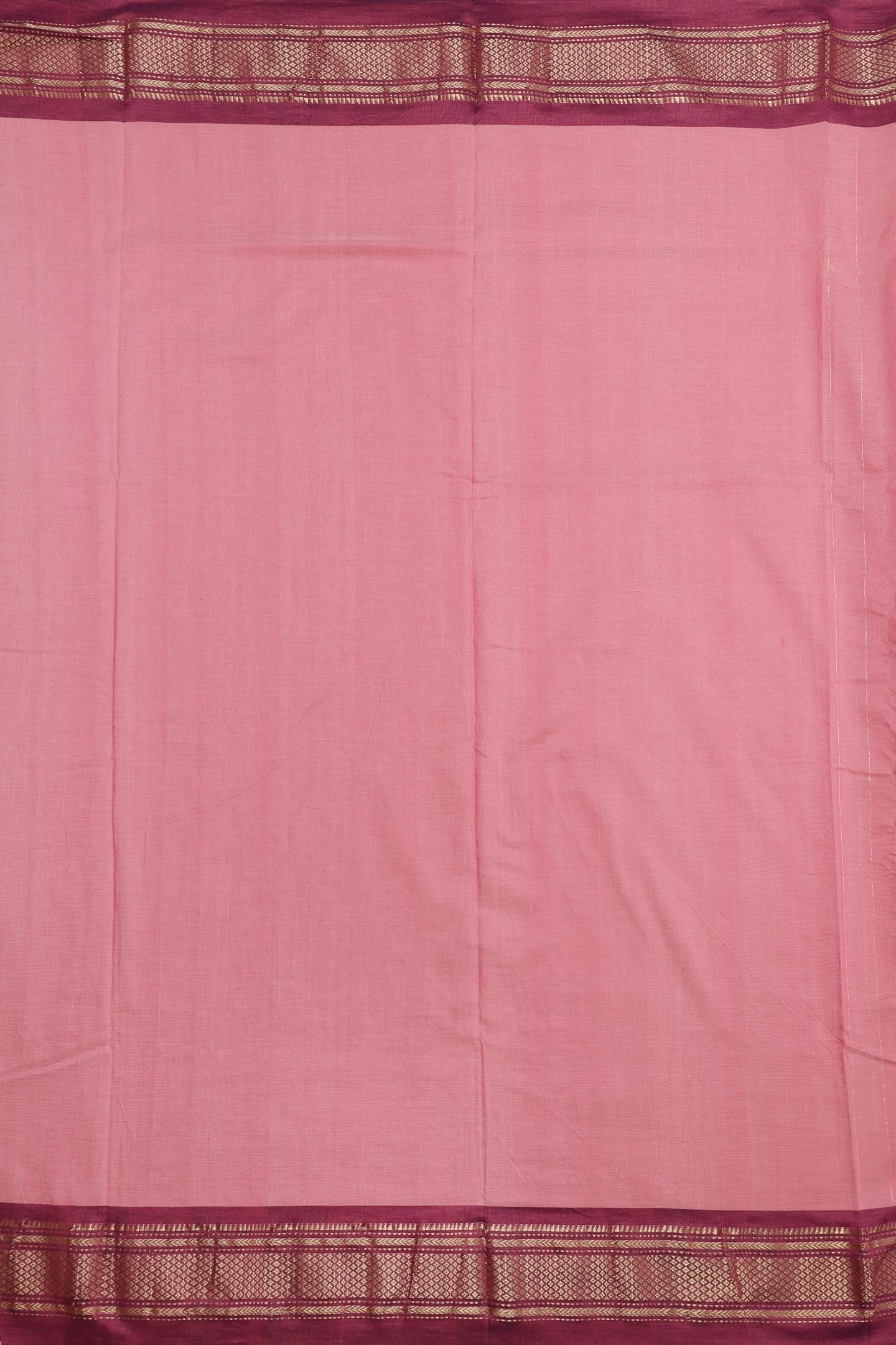 The saree features a Contrast Tissue Plain Border. The border is woven in a contrasting color and uses shimmering gold tissue threads (cotton or silk blended with metallic zari) to create a smooth, metallic frame.