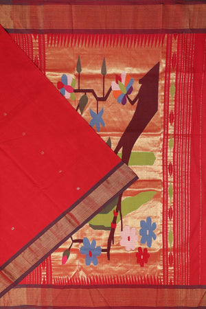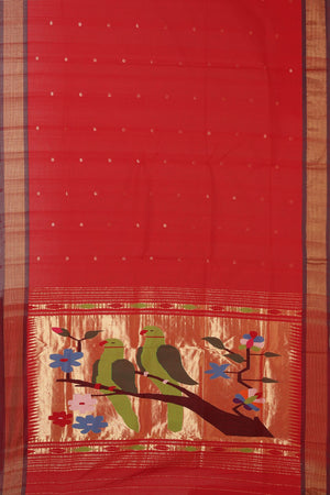 The saree is completed with a magnificent Tissue Traditional Paithani Rich Pallu. This section is densely woven with grand Paithani patterns and highlighted with generous use of gold tissue and Metallic Gold Jari for a rich, lustrous finish.