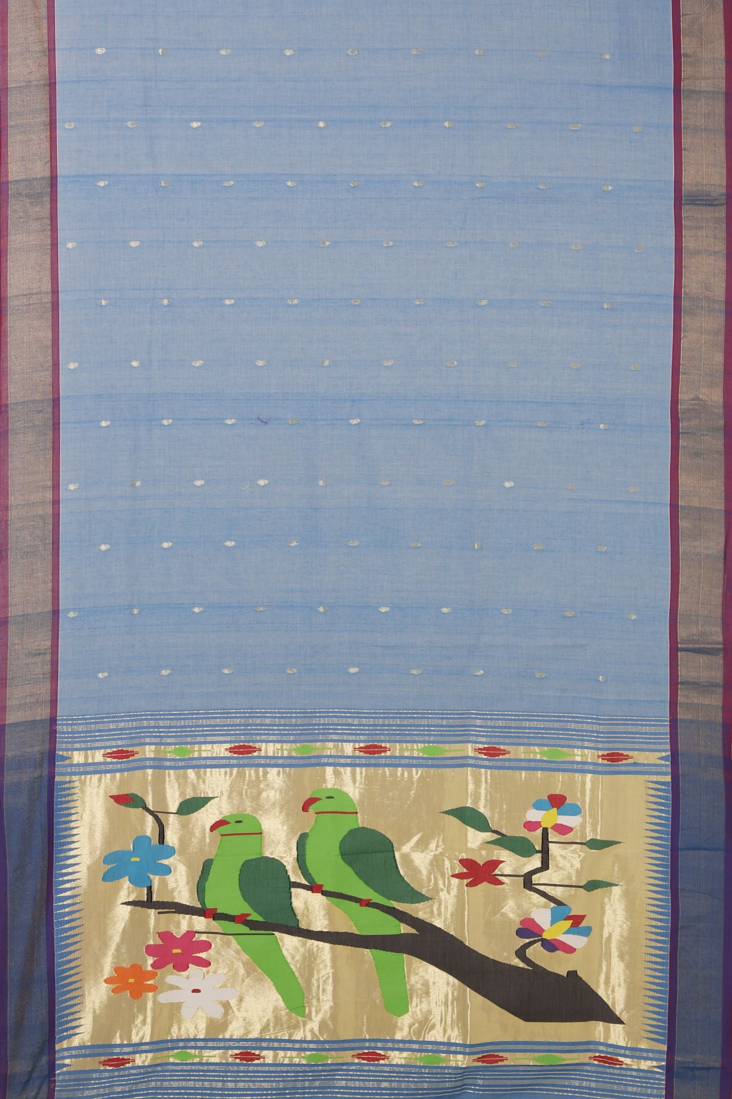 The saree is completed with a magnificent Tissue Traditional Paithani Rich Pallu. This section is densely woven with grand Paithani patterns and highlighted with generous use of gold tissue and Metallic Gold Jari for a rich, lustrous finish.