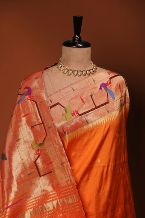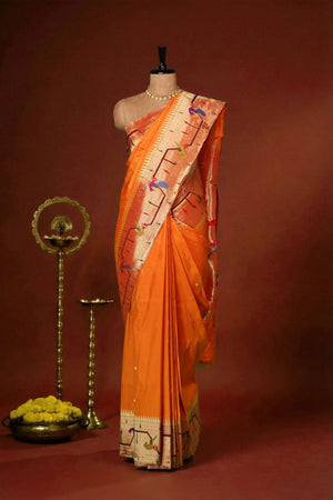 Auspicious Artistry: Handloom Silk Paithani with Peacock & Parrot Motifs