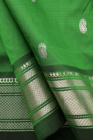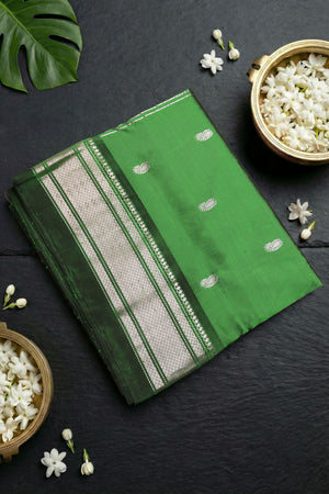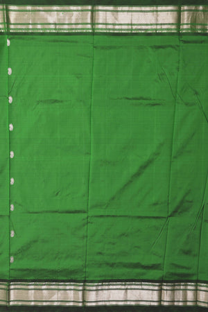 A striking Contrast Traditional Narali Border frames the saree. The Narali (coconut) motif border is a classic Paithani design, creating a tooth-like, pointed pattern that provides a sharp color break and is woven with precision.