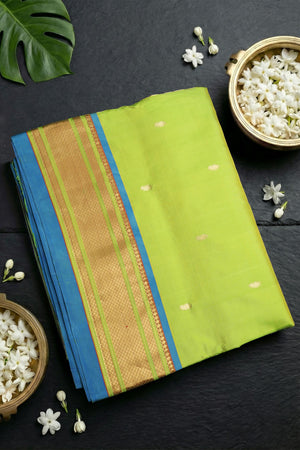 A striking Contrast Traditional Narali Border frames the saree. The Narali (coconut) motif border is a classic Paithani design, creating a tooth-like, pointed pattern that provides a sharp color break and is woven with precision.