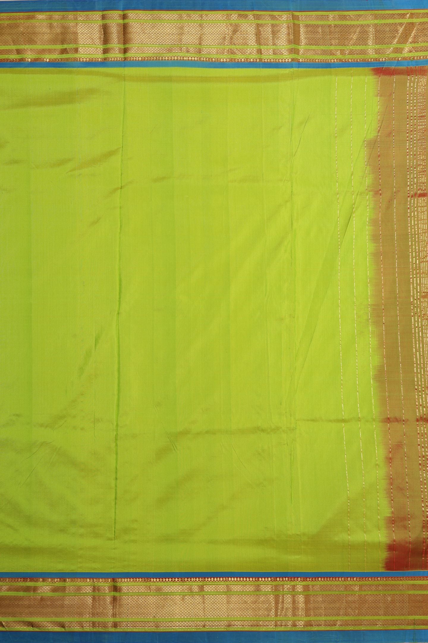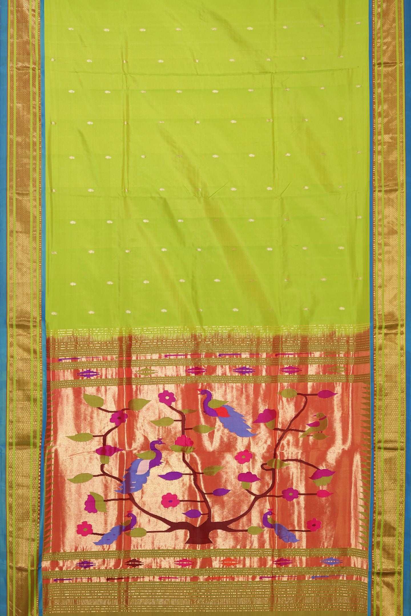 The centerpiece is the dense, luminous Tissue Traditional Paithani Rich Pallu. This section is heavily woven with ornate Paithani patterns, and the liberal use of gold Tissue thread and Metallic Gold Jari makes it incredibly rich and lustrous, designed to be the focal point of the drape.