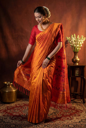 The Handloom Traditional Muniya Paithani in vibrant Mango Yellow is a celebration of classic Maharashtrian elegance. Crafted from 100% Pure Silk and hand woven by skilled artisans, this saree features delicate jari buttas spread gracefully across the body, adding a refined shimmer. The Traditional Muniya Border enhances its authentic charm, while the richly woven traditional pallu completes the regal look. Perfect for weddings, festive gatherings, and traditional ceremonies, this Paithani radiates warmth, heritage, and timeless beauty.