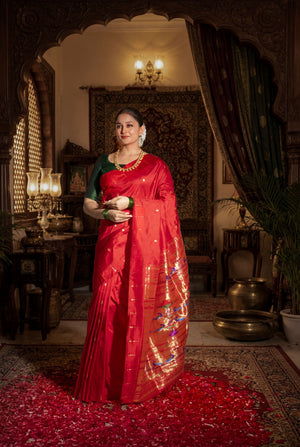 The Handloom Traditional Muniya Paithani in classic Red is a symbol of tradition, grace, and celebration. Hand woven in 100% Pure Silk, this saree features elegant jari buttas delicately spread across the body, creating a refined festive shimmer. The Traditional Muniya Border adds authentic Paithani charm, while the Traditional Rich Pallu enhances its regal appeal. A timeless choice for weddings, bridal wear, and grand festive occasions, this saree beautifully reflects heritage craftsmanship.