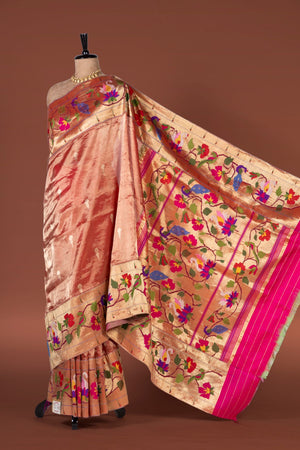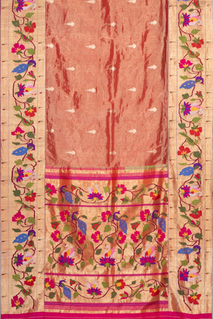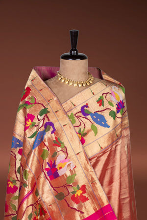 Experience timeless elegance with this Handwoven Tissue Fusion Paithani Saree, crafted to perfection with intricate detailing. The lustrous tissue fabric is beautifully enhanced with a rich peacock, parrot, floral, and swan motif border, complemented by traditional muniya accents on both sides. Paired with a grand designer pallu and subtle jari butti work across the body, this saree is a perfect blend of heritage and contemporary charm, ideal for weddings and festive occasions.