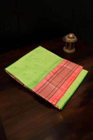 Experience the fusion of tradition and accessibility with this exquisite Kadiyal jacquard saree. Expertly crafted on a Jacquard loom using the finest Pure Silk, this saree features a deep Parrot Green base, perfect for grand occasions.