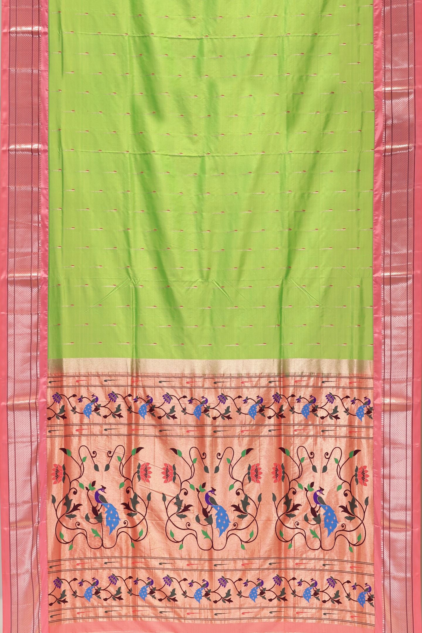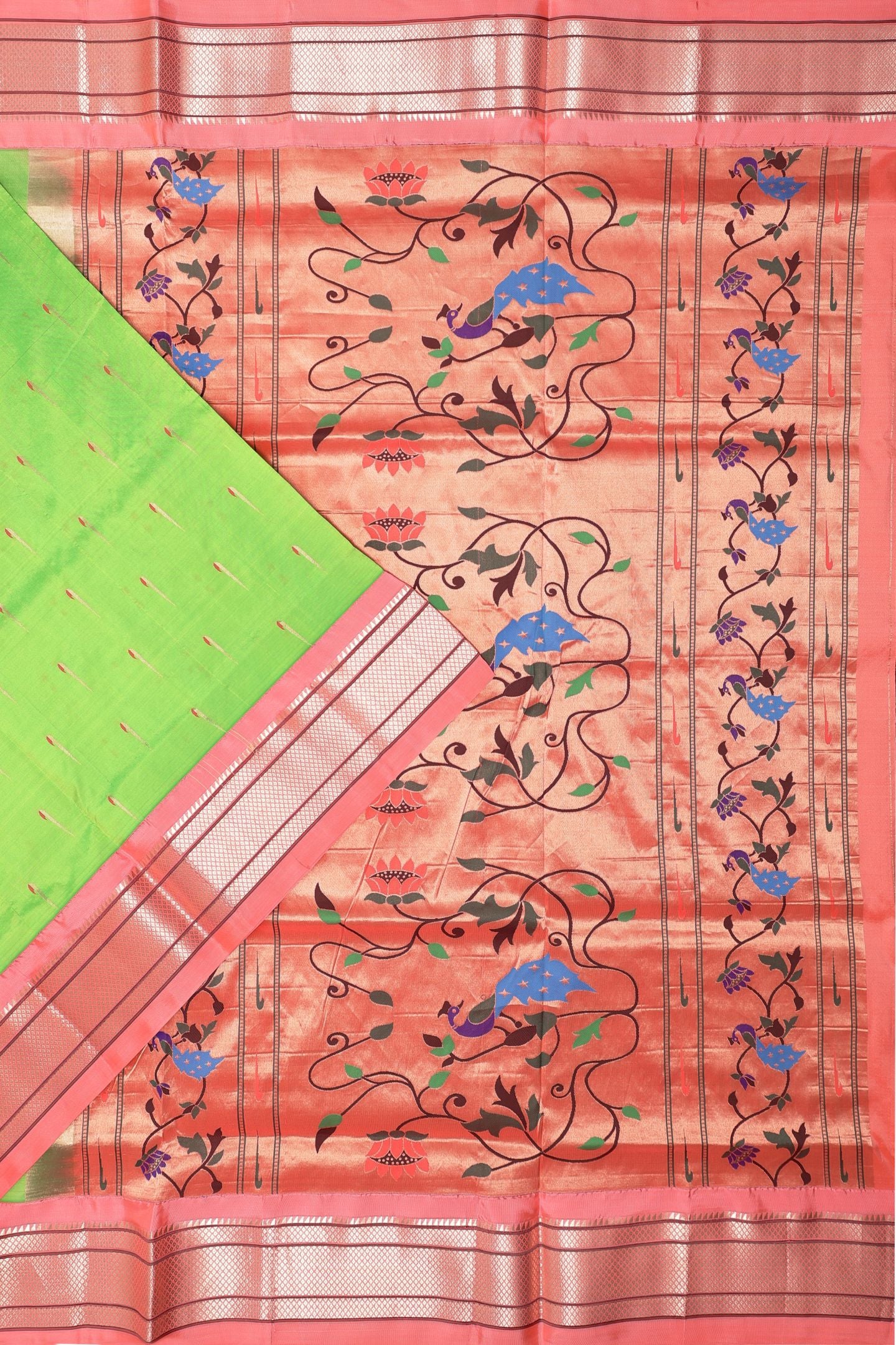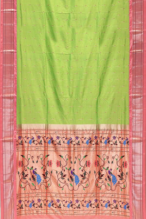 - The Pallu: The saree culminates in a magnificent, heavy Traditional Paithani Type Rich Pallu. This ornate pallu showcases complex patterns and dense Jari work, capturing the regal aesthetic of traditional Paithani Type weaving.