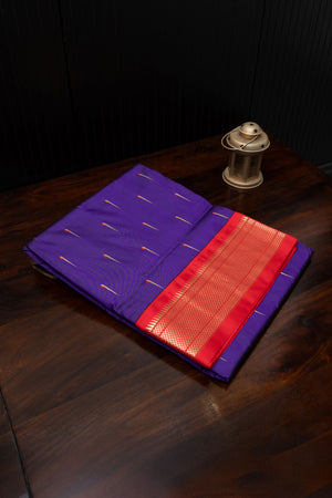 Experience the fusion of tradition and accessibility with this exquisite Kadiyal jacquard saree. Expertly crafted on a Jacquard loom using the finest Pure Silk, this saree features a deep Purple base, perfect for grand occasions.