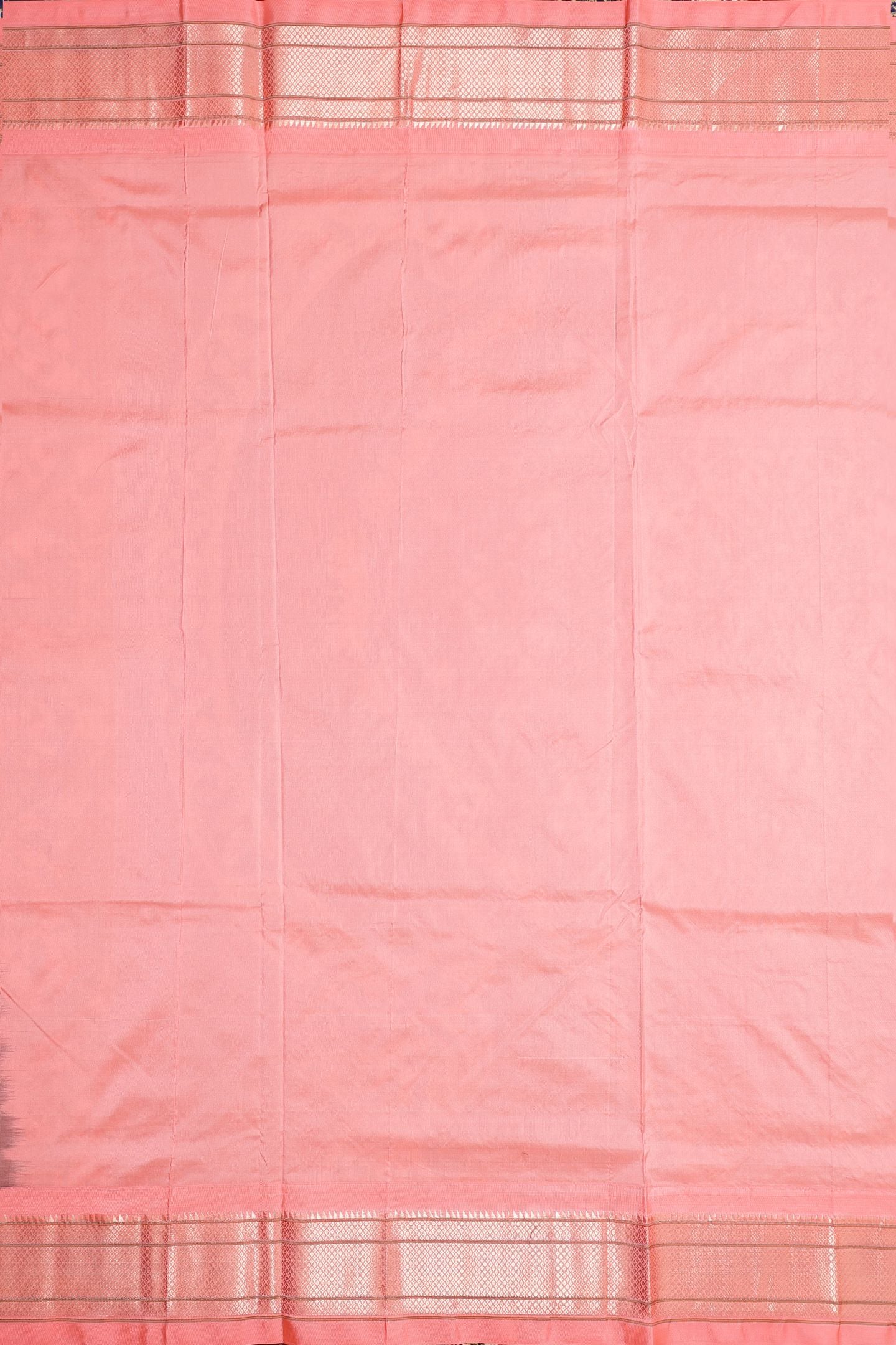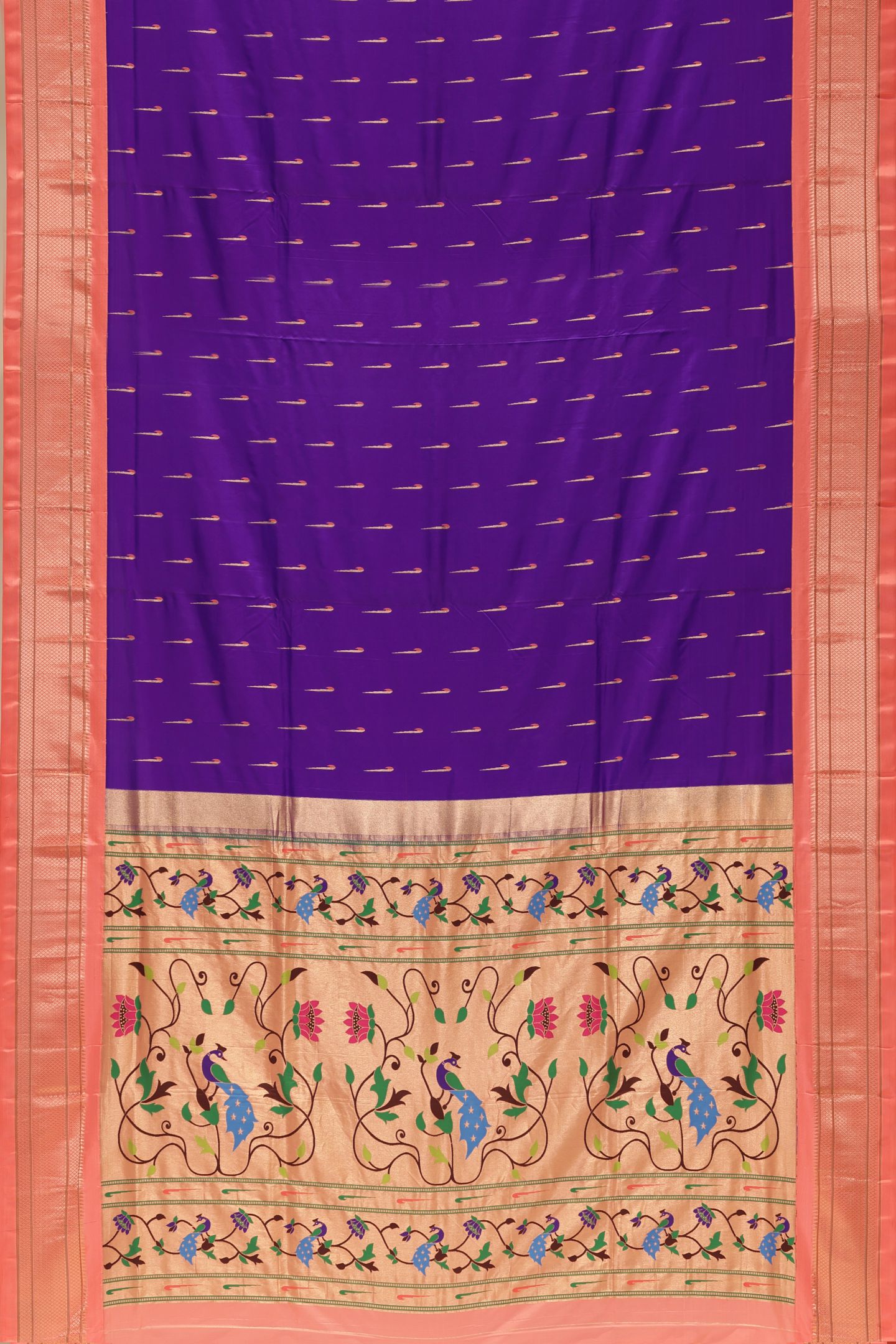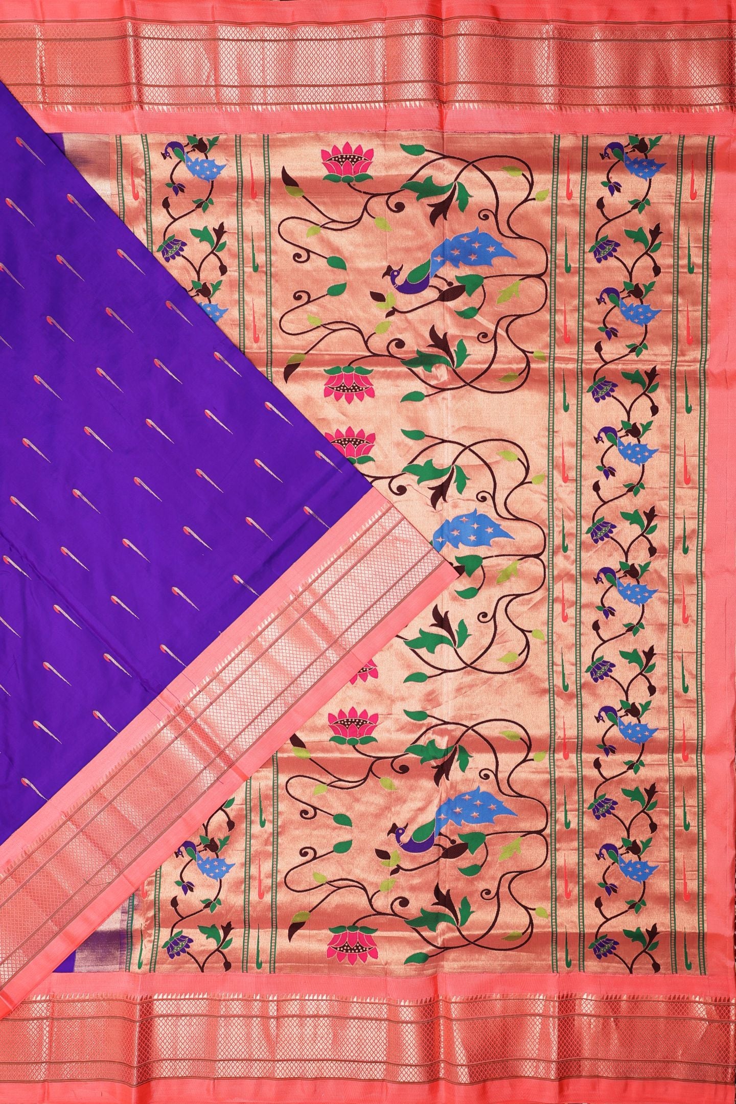 - The Pallu: The saree culminates in a magnificent, heavy Traditional Paithani Type Rich Pallu. This ornate pallu showcases complex patterns and dense Jari work, capturing the regal aesthetic of traditional Paithani Type weaving.
