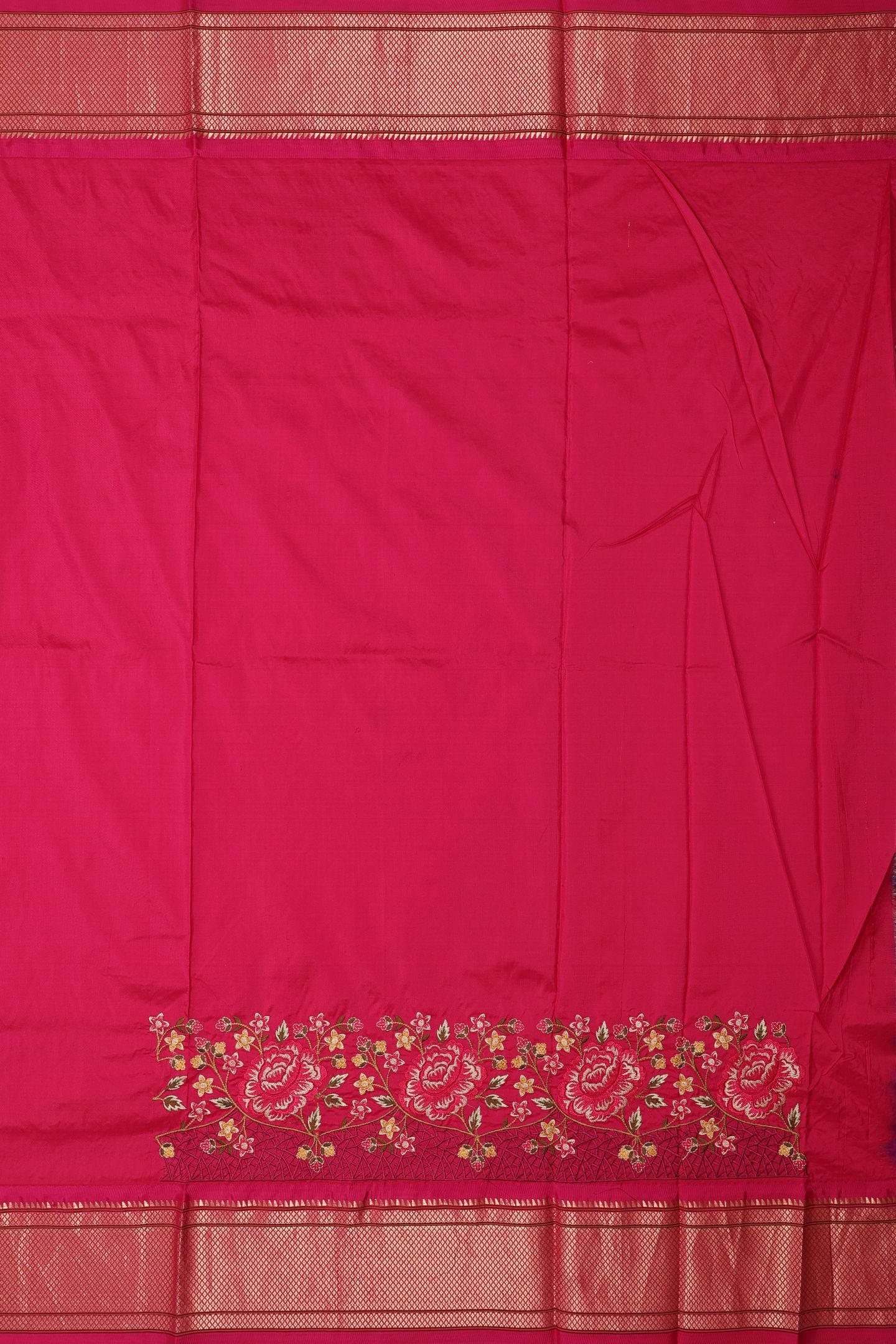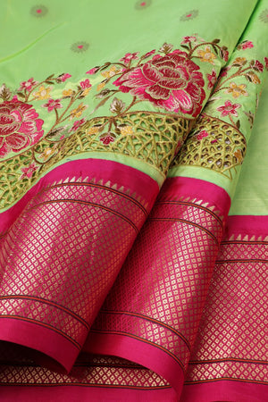 The saree features an elaborate Contrast Border with Petate Multicolor Floral Cut Work. Intricately woven floral patterns in multiple colors create a cut-work effect, beautifully highlighted and framed with Metallic Gold Jari.