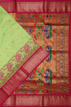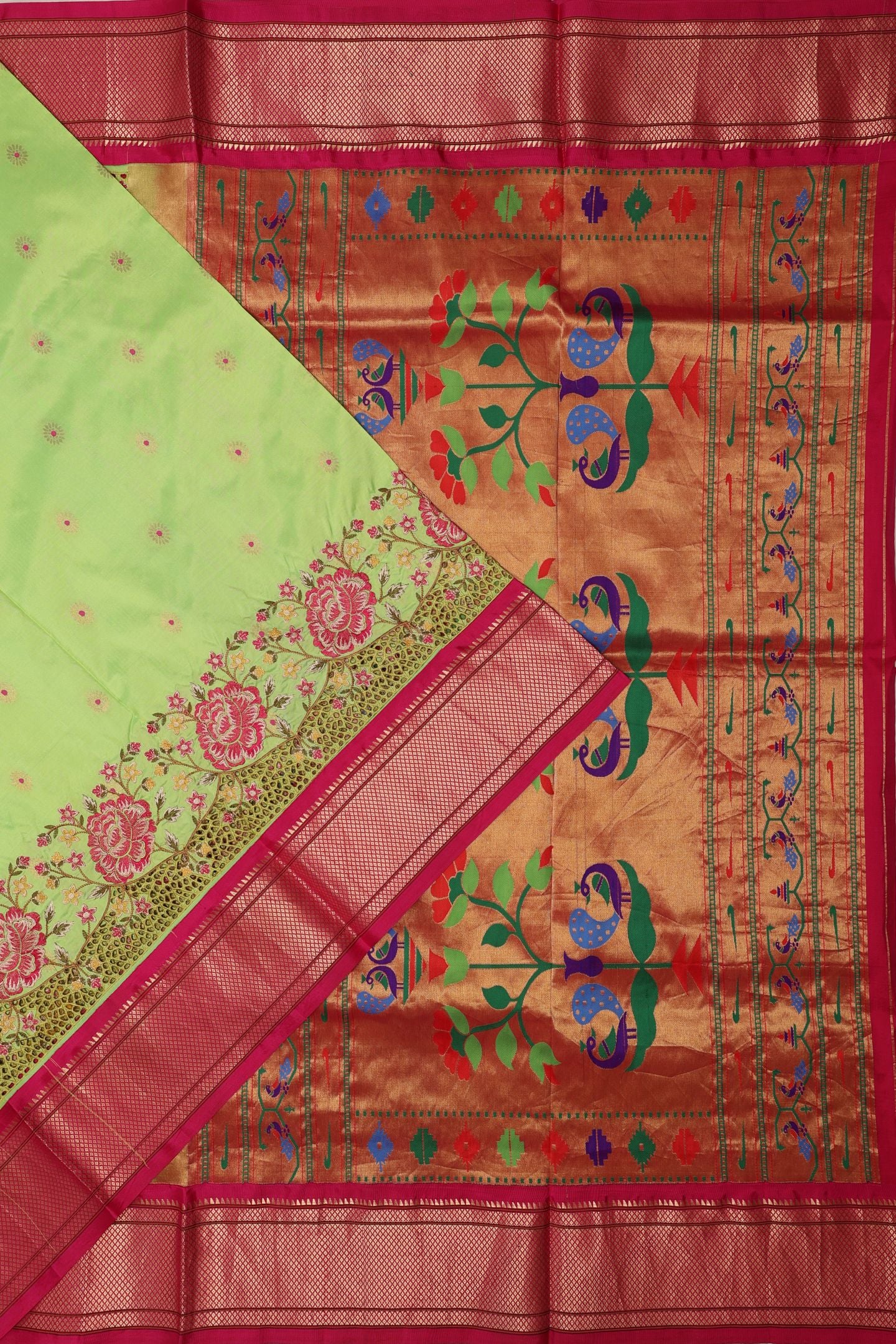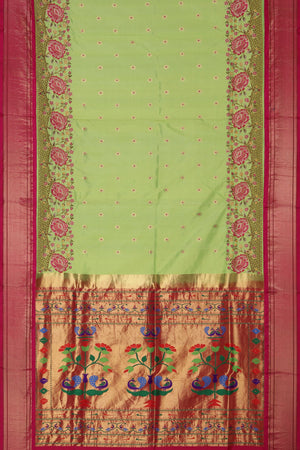 The body is enriched with all-over small golden butta. These motifs are enhanced with border-matching Meena work, where colored silk threads reflect the contrast border shades for a harmonious design flow.
