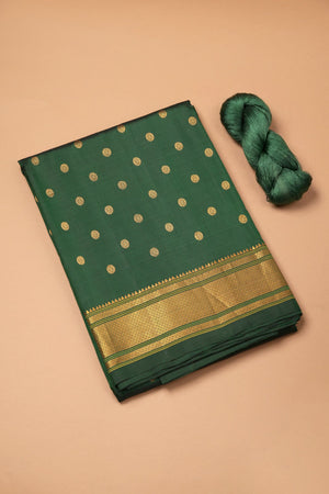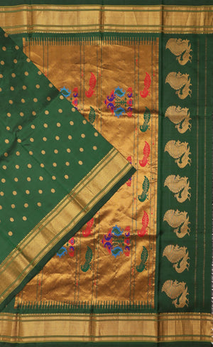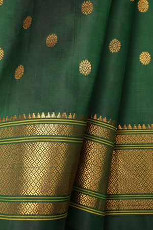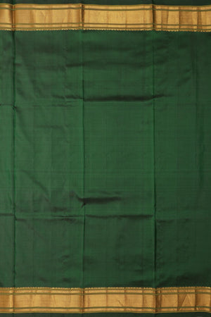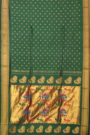The self rich pallu matches the body color and is heavily woven with Metallic Golden Jari. It features traditional Peacock motifs and is finished with auspicious Chakra (wheel) motifs at both the beginning and end of the pallu.