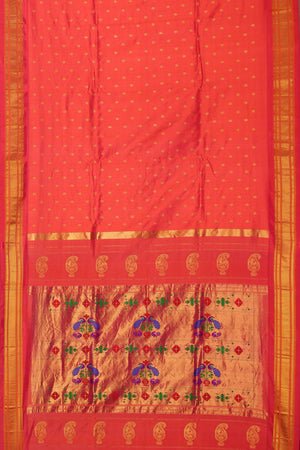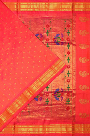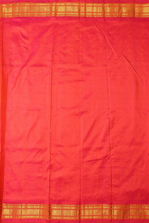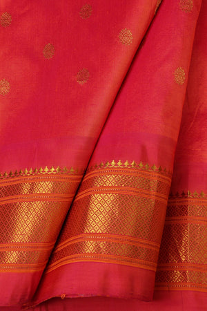 The self rich pallu matches the body color and is heavily woven with Metallic Golden Jari. It features traditional Peacock motifs and is finished with auspicious Chakra (wheel) motifs at both the beginning and end of the pallu.