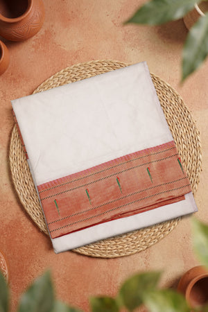 Accented with a classic Single Muniya Golden Jari Border, showcasing a distinct row of traditional Muniya (parrot) motifs. Woven in metallic gold jari, the border adds a sophisticated and timeless finish.