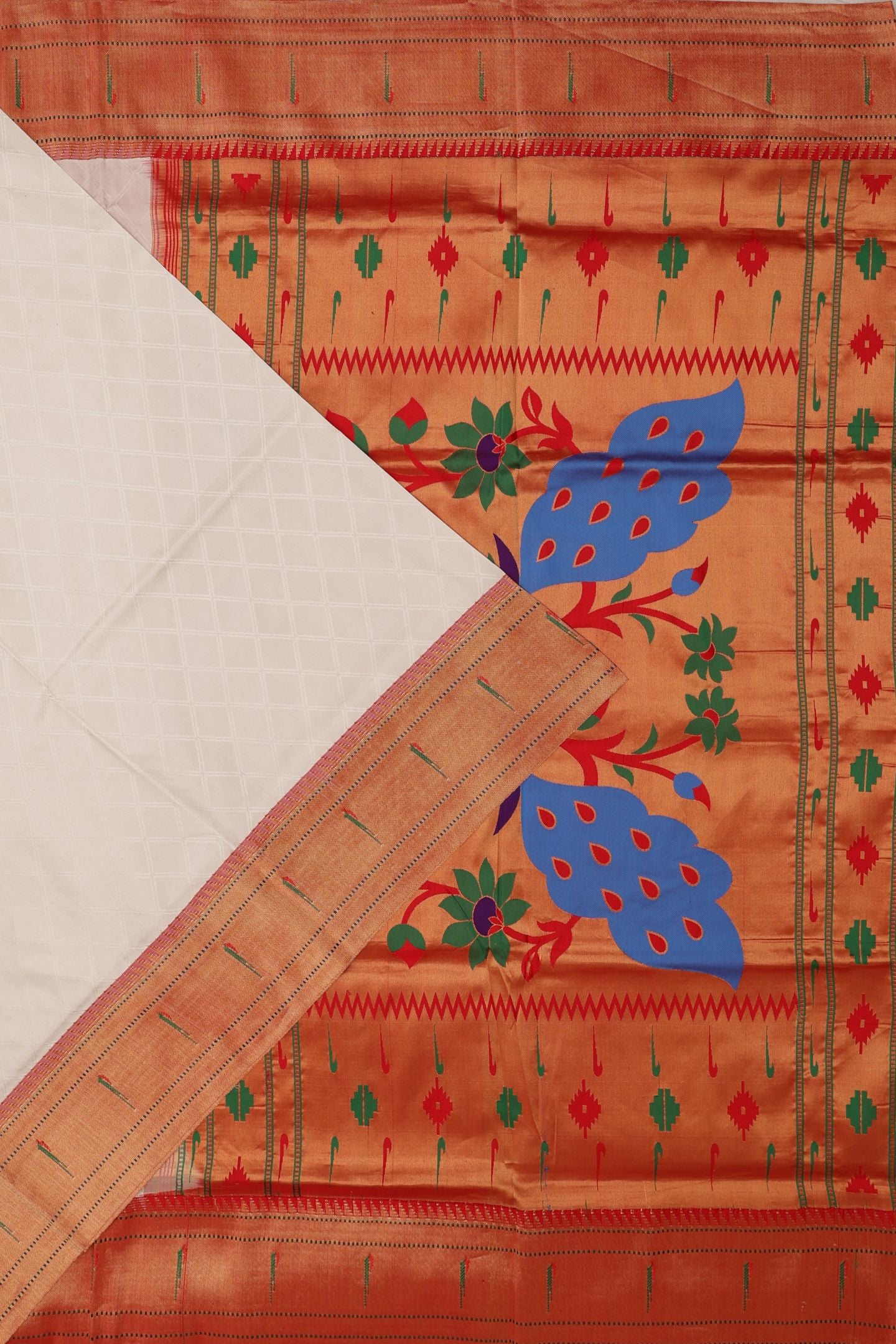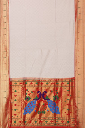 This saree is an ideal choice for those who appreciate understated texture on the body paired with the dramatic richness of a traditional Paithani pallu.