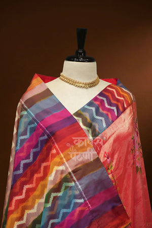 Add a vibrant touch to your ethnic collection with this stunning Fusion Leheriya Allover Brocade Paithani saree. Crafted in pure silk, this saree features a beautiful floral brocade body enriched with intricate detailing, perfectly complemented by a striking multi-colour lahriva border and a rich fusion pallu. The blend of traditional Paithani elegance with contemporary lahriva patterns makes this saree a true statement piece for grand occasions.
