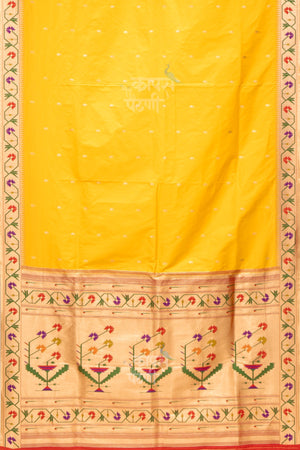 A vibrant Traditional Asavali Border Designer Saree in a rich yellow shade, crafted from semi silk for a graceful drape. Highlighted with elegant jari mango butti and a classic Asavali border, this saree brings together tradition and contemporary charm, perfect for festive and cultural occasions.