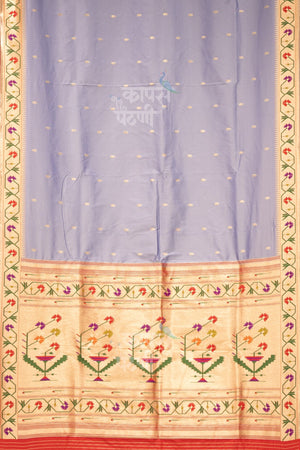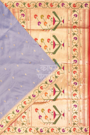 Soft and sophisticated, this Traditional Asavali Border Designer Saree in a subtle lavender grey shade is crafted from smooth semi silk fabric that offers a graceful drape and refined sheen. Accentuated with a classic Asavali floral border and delicate jari mango butti across the body, it beautifully reflects timeless elegance. The rich designer pallu adds to its charm, making it a perfect choice for festive and traditional occasions.