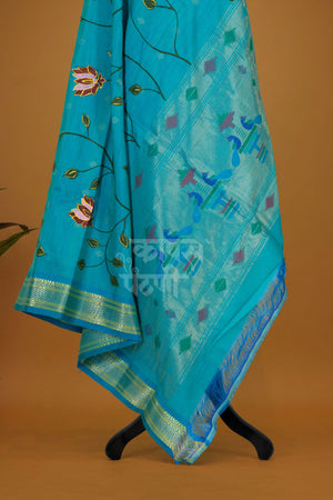 Embrace timeless elegance with this Traditional Hand Painted Dupatta, crafted in luxurious silk with a jacquard weaving base. Adorned with delicate hand-painted floral motifs and complemented by a classic Narali border with golden zari accents, this dupatta reflects fine artistry and heritage charm. Its graceful drape and intricate detailing make it a perfect addition to elevate any traditional or festive outfit.