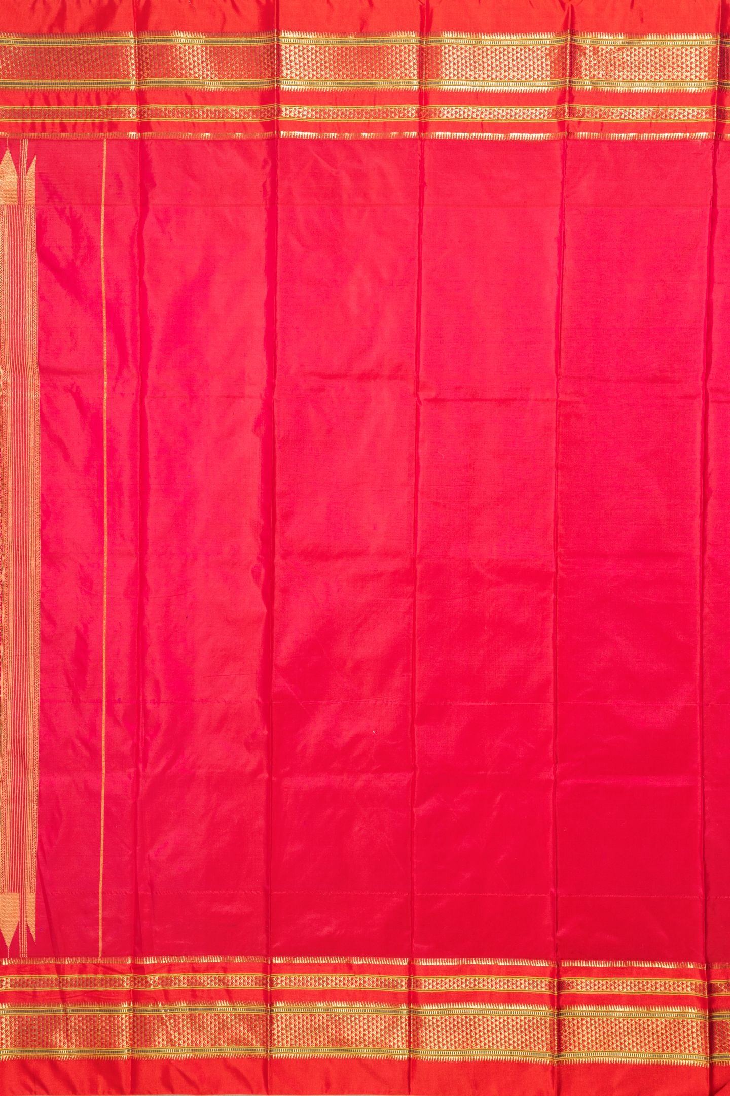 The highlight of this saree is its Traditional Rich Pallu, intricately woven with metallic golden jari that enhances its festive grandeur. The pallu carries a dense and elegant traditional design, making it the focal point of the drape during weddings and special celebrations.