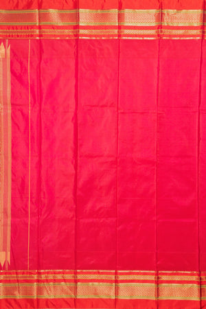 Woven using the Traditional Jacquard Weaving Technique, the saree showcases intricate craftsmanship with precise detailing. The signature Irkal Temple Border is inspired by temple architecture motifs, symbolizing strength, spirituality, and cultural richness. The structured temple edging adds a bold and classic frame to the saree.