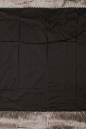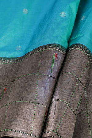 The saree is highlighted primarily with Metallic Silver Jari, lending it a cool, sophisticated glow while maintaining a strong traditional character.