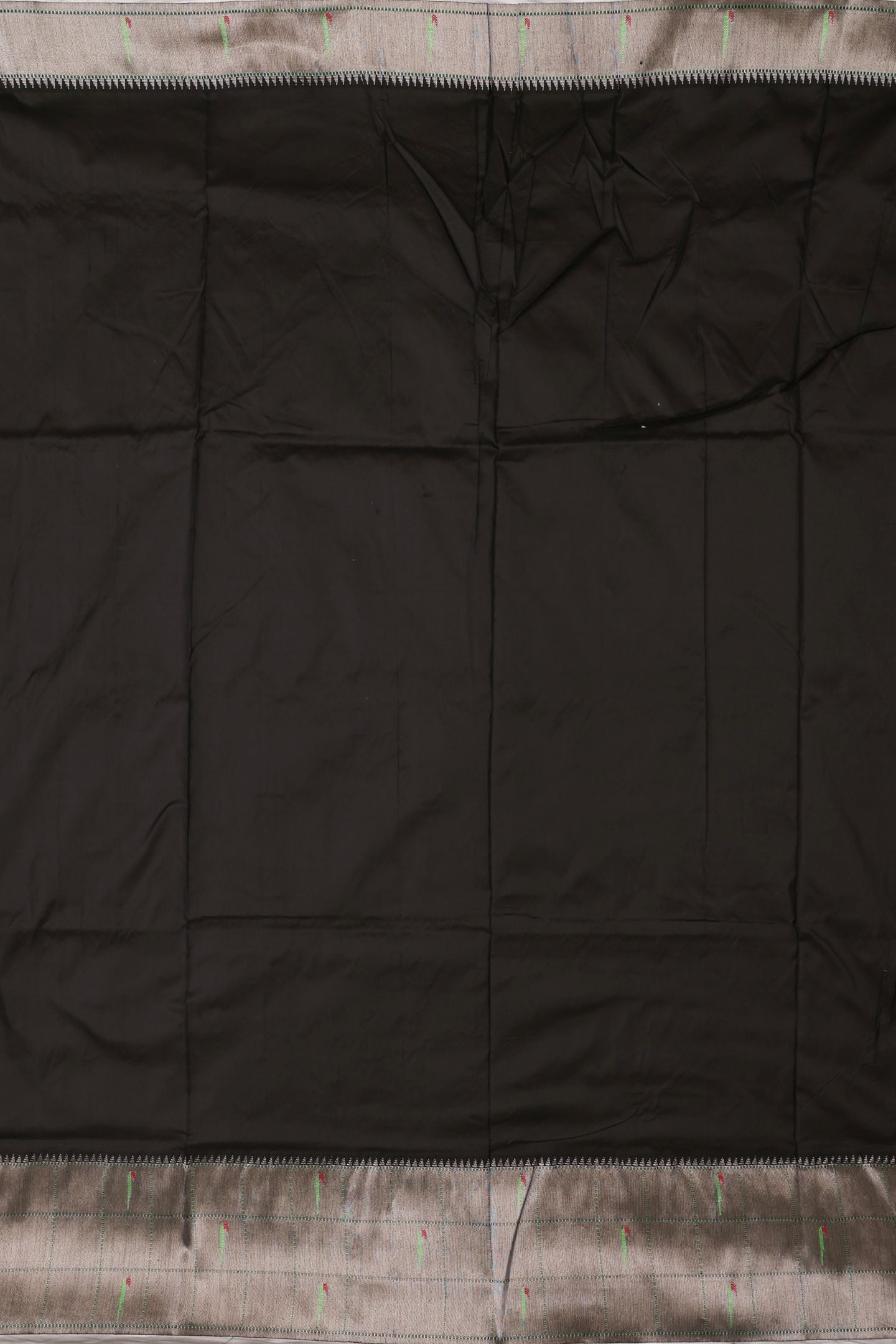 The saree features a unique One Side Triple Muniya Border, where one long edge is adorned with three rows of the traditional Muniya (parrot) motif. These motifs are intricately woven using Metallic Silver Jari, creating an elegant asymmetric statement that enhances the overall drape.